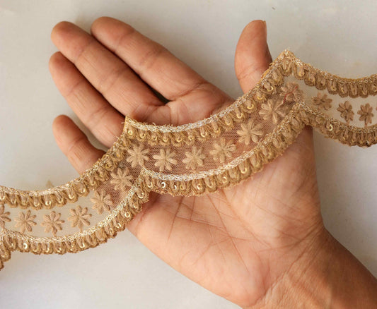 Beige Floral Scallop Embroidered Trim, Beige Net Border, Cutwork Floral Net Lace, Indian Fabric Trim, Beige Saree Border, Price/mtr