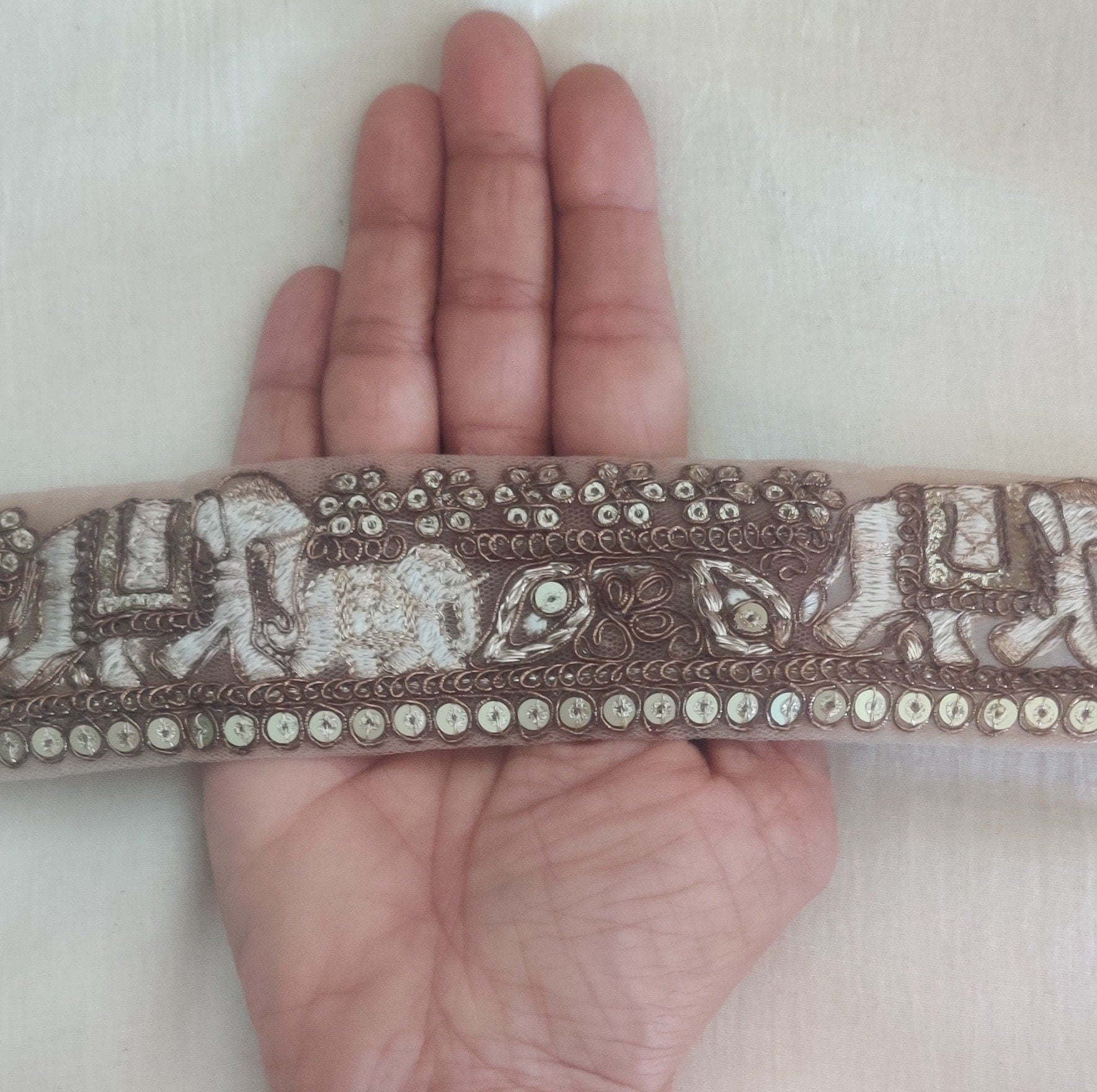 A beautiful trim with elephants marching along a garden full of blooming flowers with their little baby elephants in tow. Embroidered in light cream threads and zari (golden threads) in differnet shades of light and dark gold, on a golden beige net fabric. Embellished with light gold sequins for additional glamour. Such trims are used frequently by many Indian designers to make their outfits very royal and glamorous.