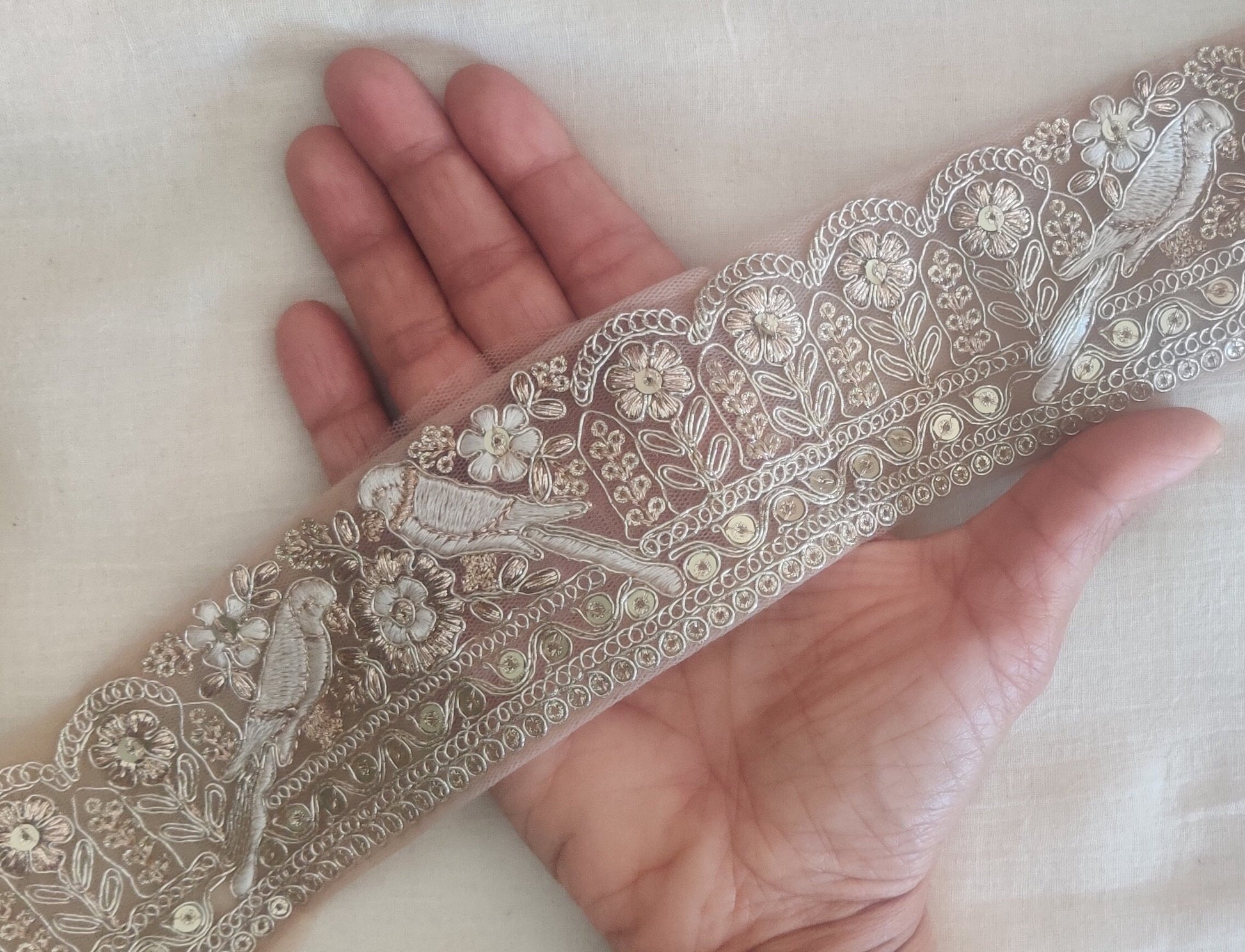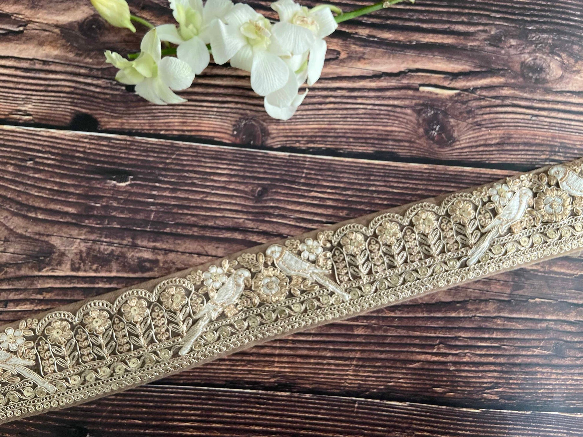 Beige Gold Parrot Embroidered Trim, Golden Zari Parrot Net Border, Royal Indian Designer Lace, Exotic Bird Saree Border