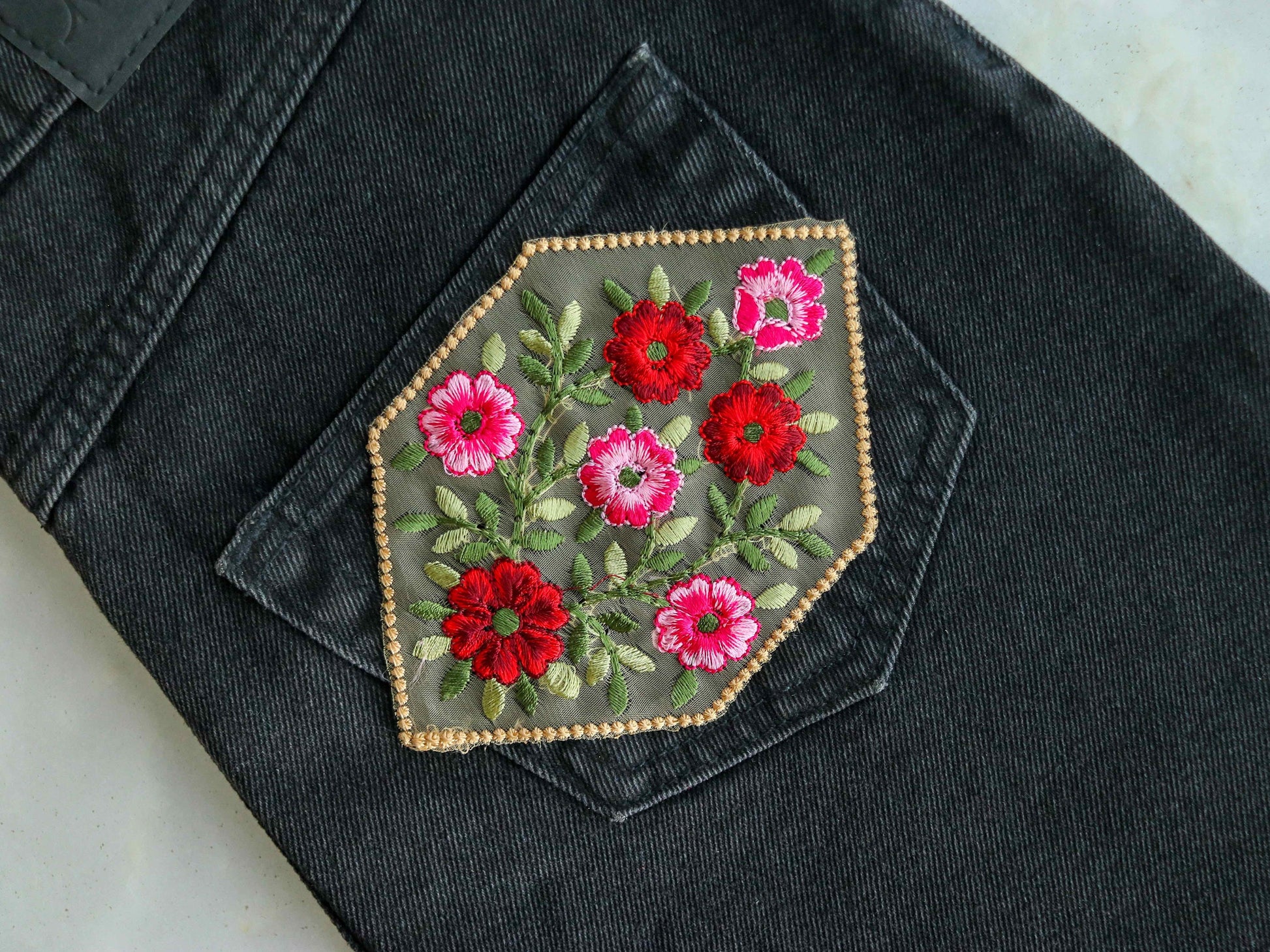 A very cheerful, boho floral patch, in a unique hexagonal shape. Showing vibrant flowers created with colourful red and pink threads, on a soft beige net fabric. Very precise embroidery detailing out each flower. A bouquet sure to brighten up any project!