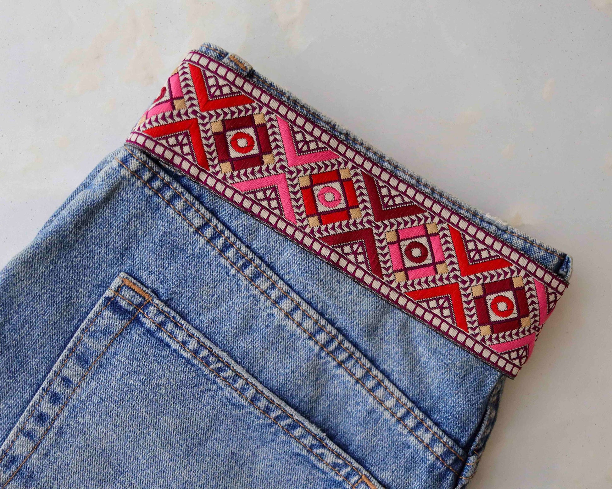 This boho trim is created with a brocade weave, with a geometric checks motif woven in red, pink and beige. The colour combination and design give a very vintage and boho look to the trim. And to any project you use it on.