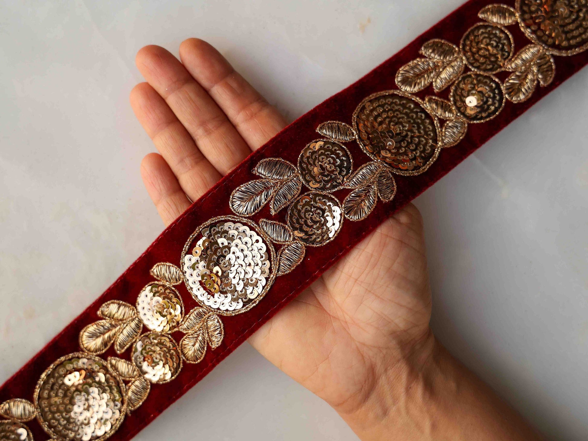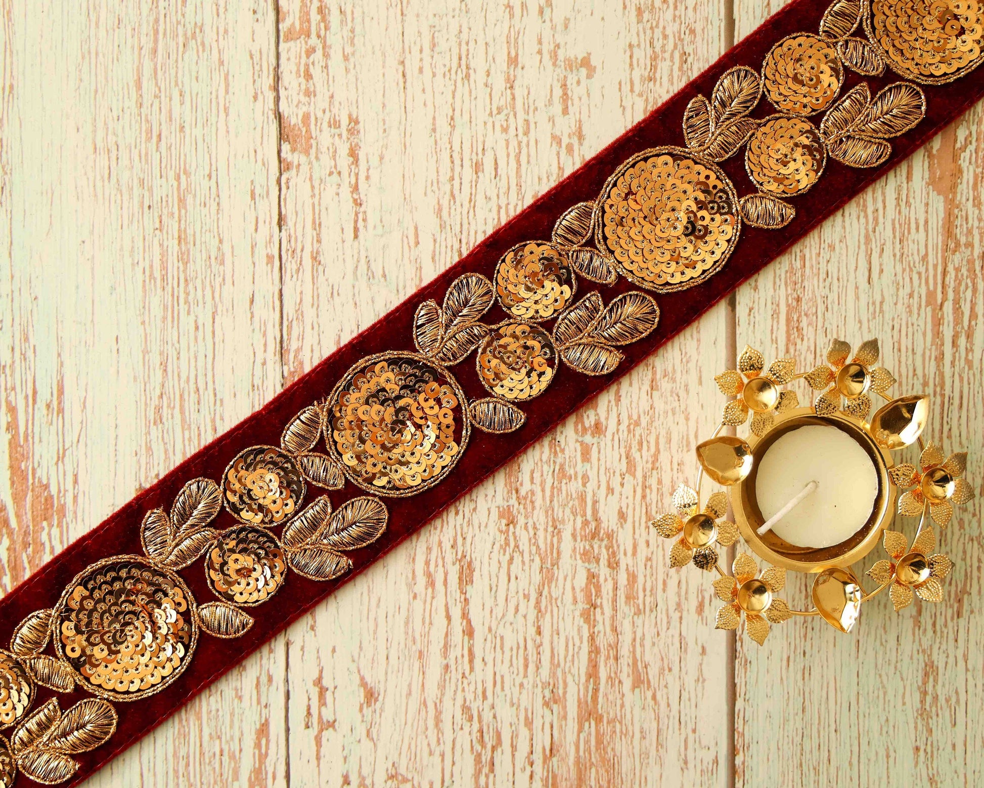 Berry Gold Velvet Floral Trim,Indian Embroidered Border,Deep Red Gold Floral Lace,Floral Velvet Saree Border,Maroon Velvet Border,Price/mtr
