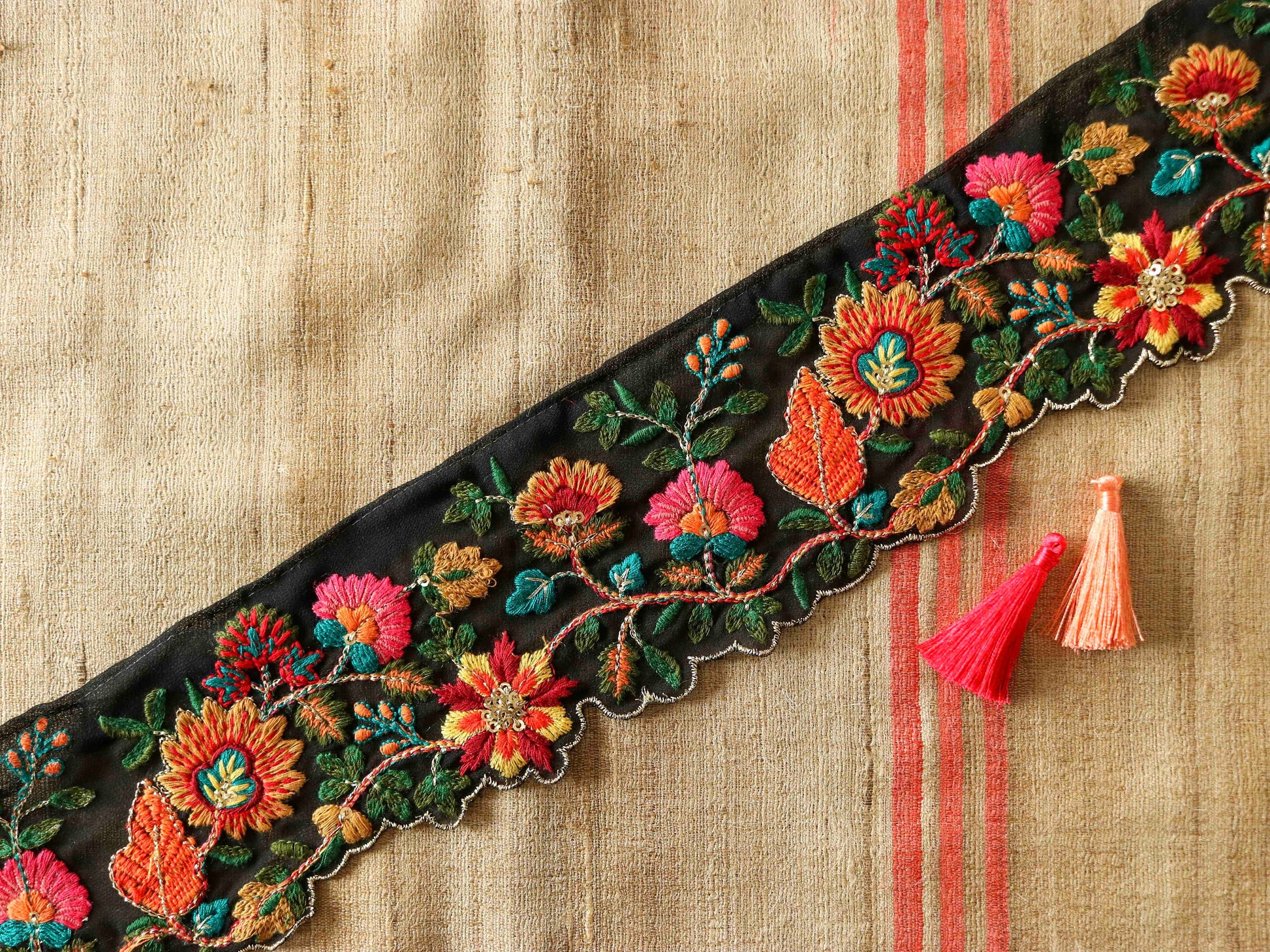 Black Floral Cutwork Embroidered Trim,Floral Tissue Border,Black Pink Orange Floral Lace,Indian Fabric Trim,Floral Saree Border,Price/mtr