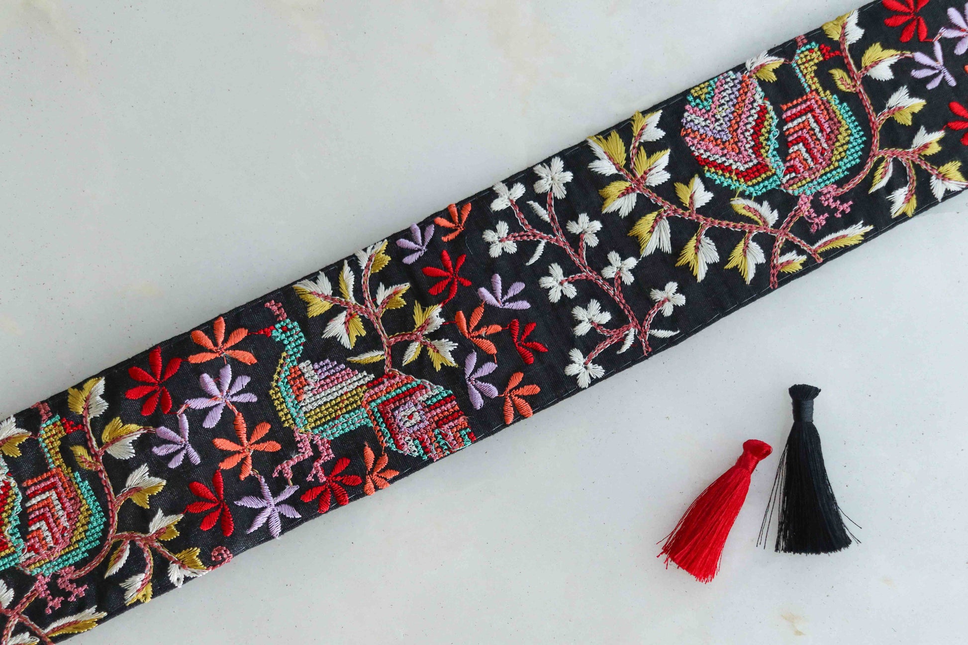 Black Floral Peacock Embroidered Trim, Cross Stitch Embroidery Border, Rustic Kashmiri Lace, Peacock Saree Border,