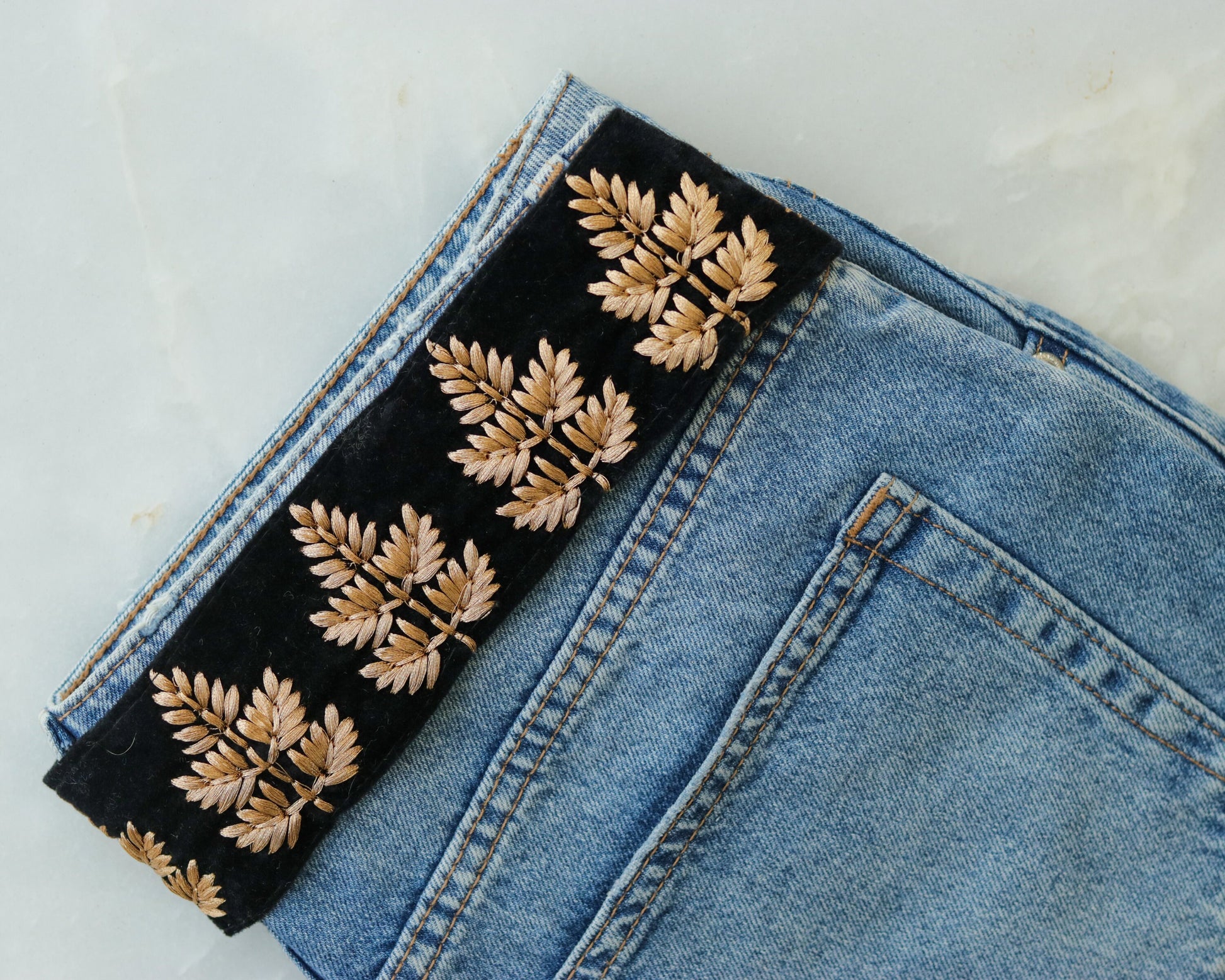 A luxurious trim on black velvet, with gorgeous pine trees embroidered in gold sari. Classic black and gold in a quirky Christmas avatar.