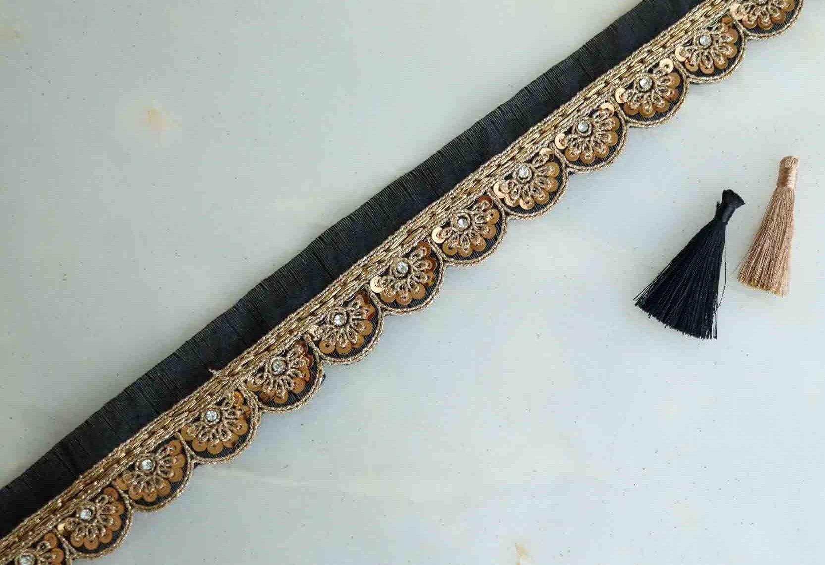 Black Gold Scallop Embroidered Trim,Cutwork Gold Zari Sequin Border,Bridal Designer Lace,Black Gold Floral Saree Border,インド刺繍リボン, Price/mtr
