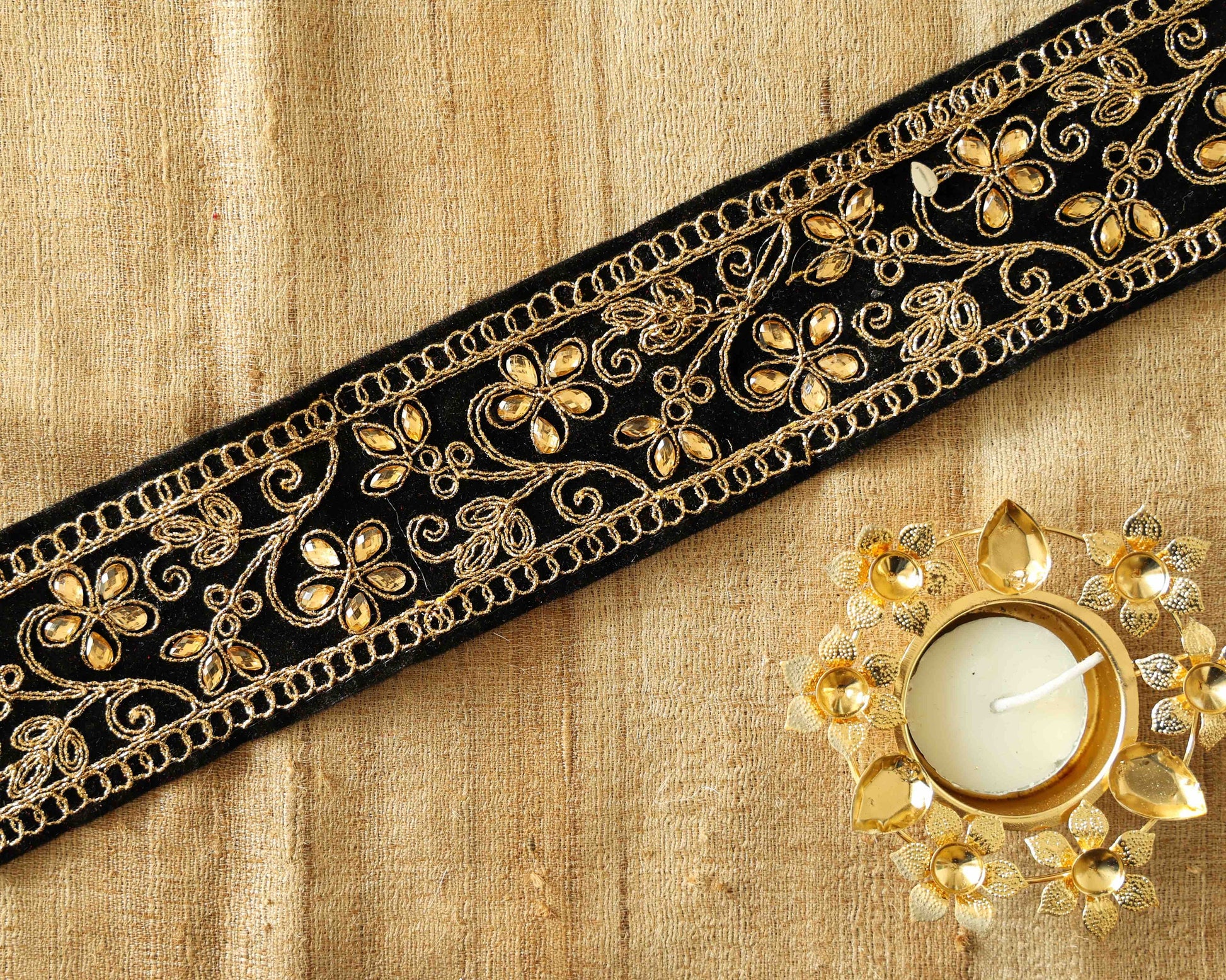 Black Gold Velvet Floral Trim, Indian Embroidered Fabric Border, Black Gold Floral Diamante Lace, Black Saree Border, 75 cm, CL
