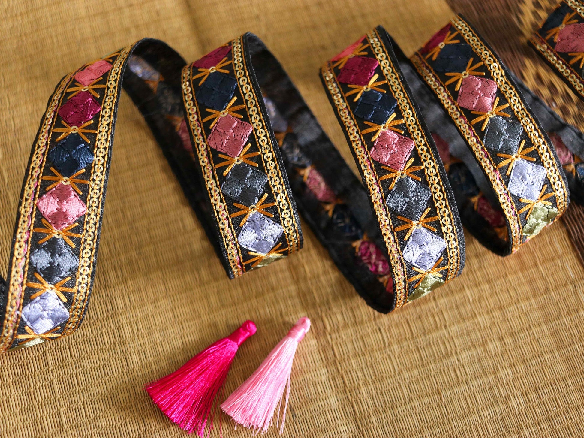 Black Pink Floral Embroidered Trim,Black Earthy Checks Sequin Border,Black Square Lace,Indian Trim,Black Saree Border,Price/mt