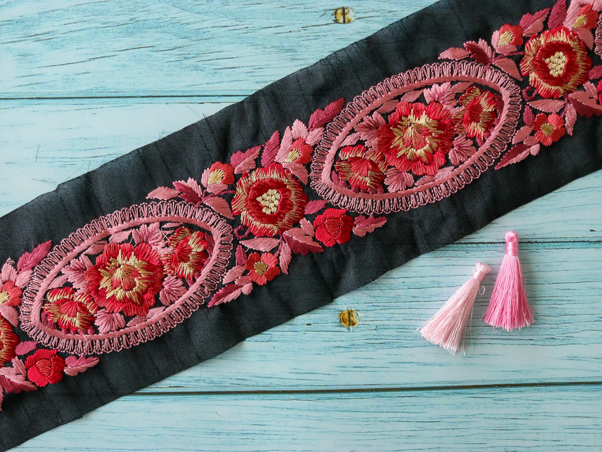 Black Pink Floral Embroidered Trim,Indian Kashmiri Border,Black Pink Rose Floral Lace,Black Pink Saree Border,Price/mtr