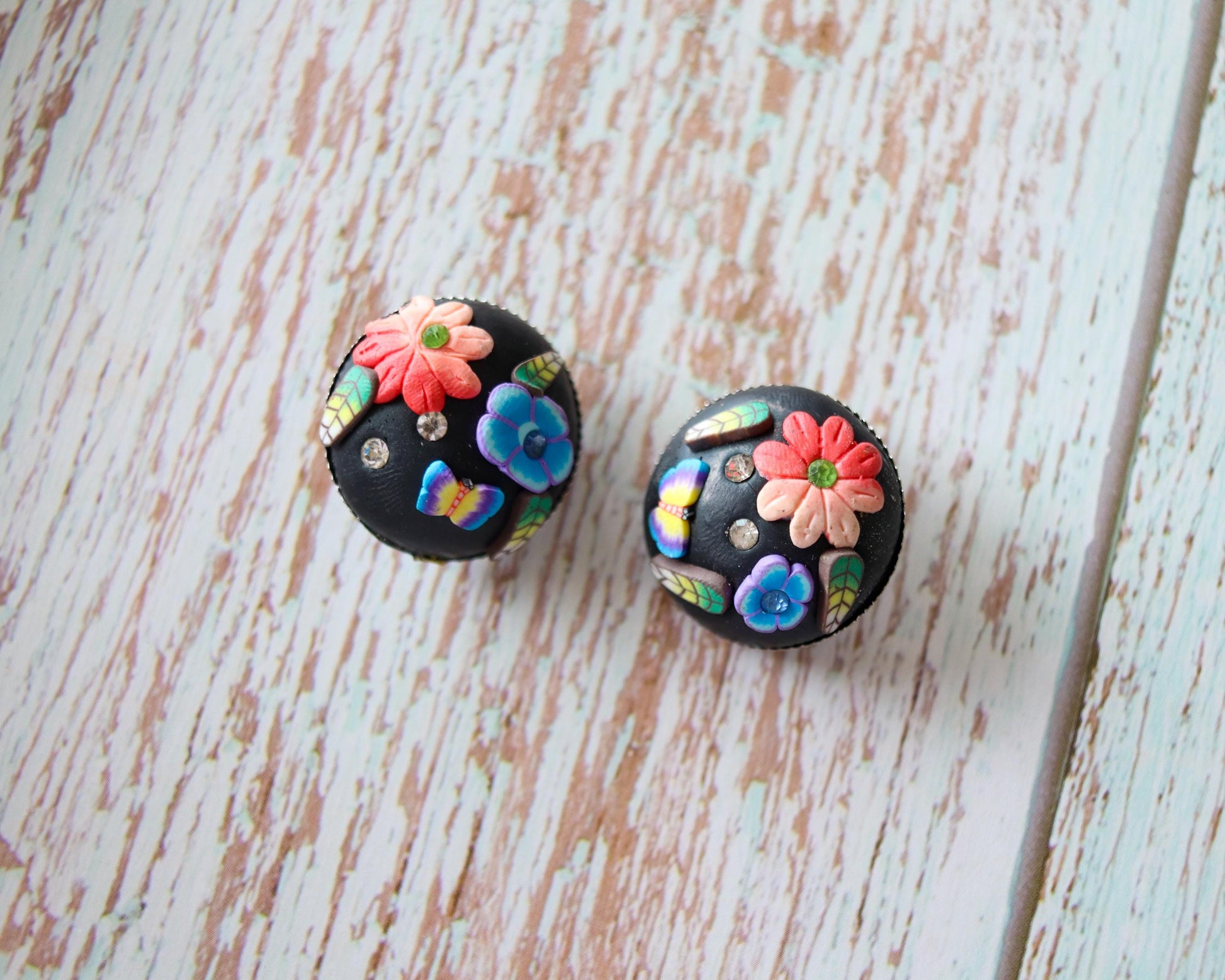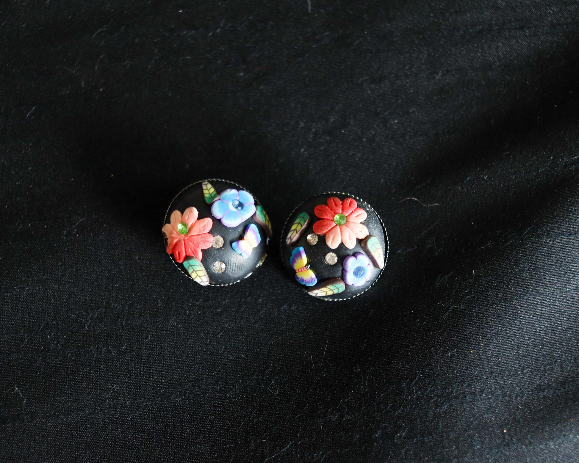 A pretty little button in black with a cute burtterfly created on it in peach and pink, among tiny flowers. Embellished with a couple of tiny diamantes for a bit of glam. The sculpted flowers give the button a unique 3-D and handpainted look.