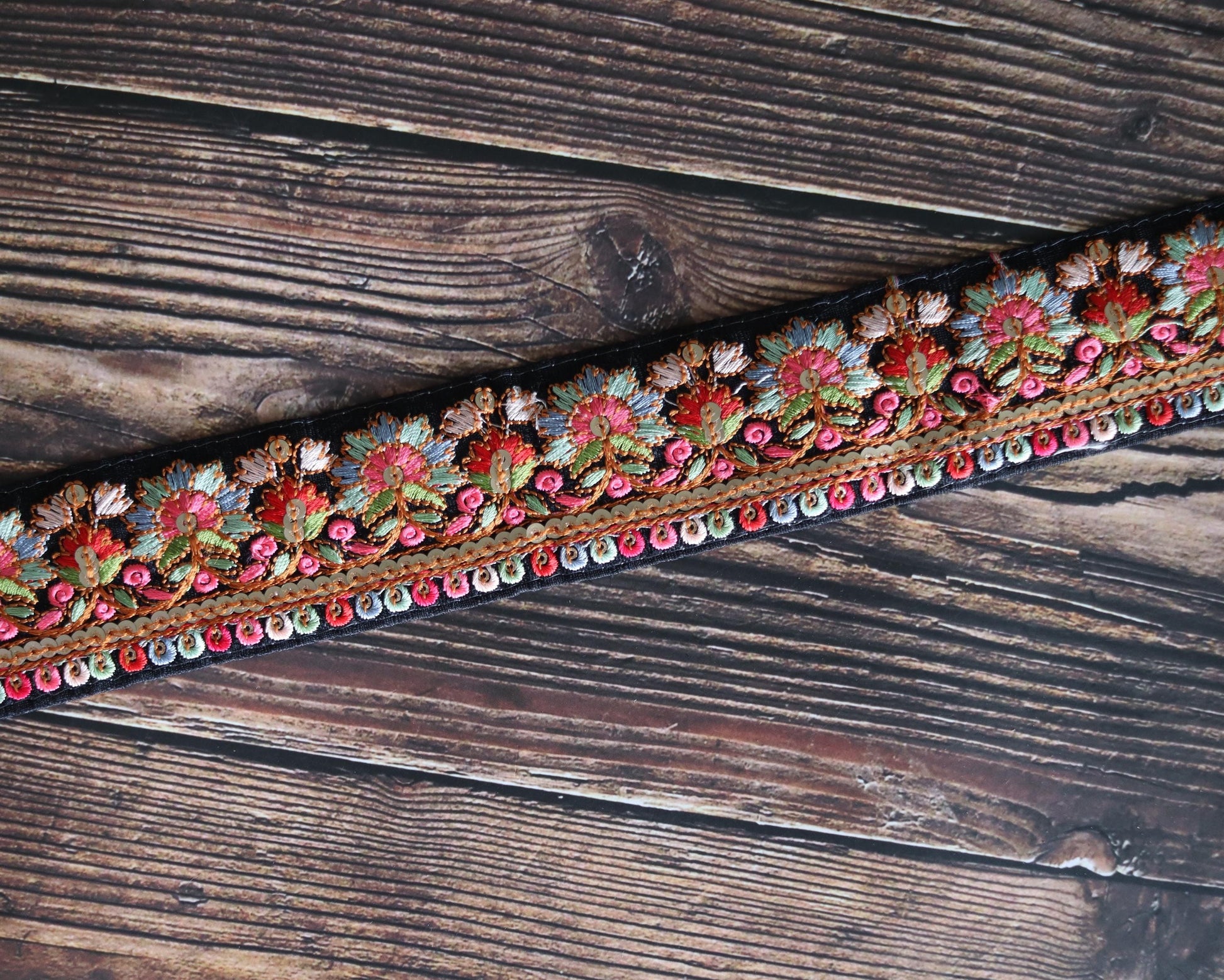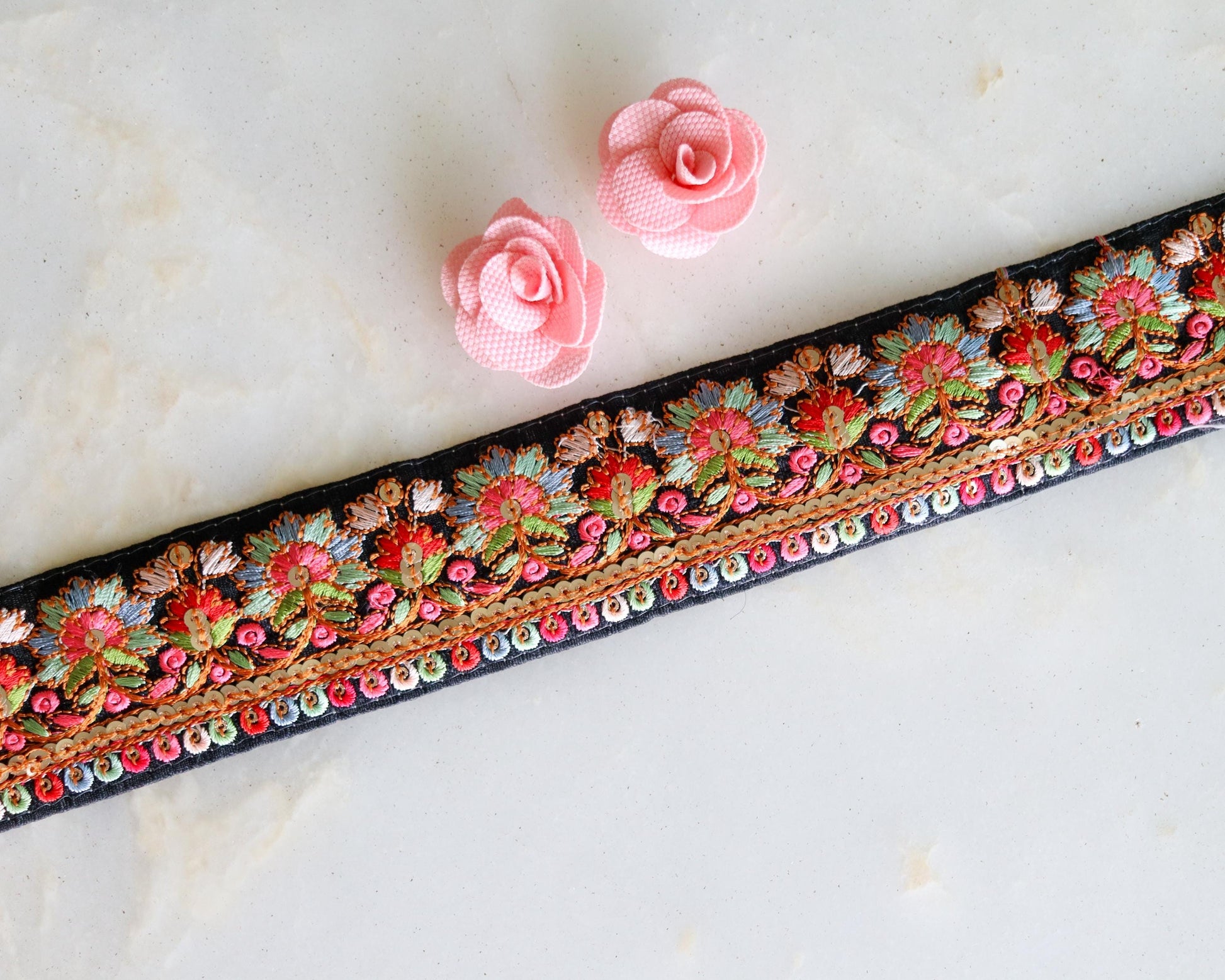 Black Red Floral Embroidered Trim, Red Black Floral Lace, Black Floral Saree Border, Indian Fabric Trim, インド刺繍リボン, Price/mtr