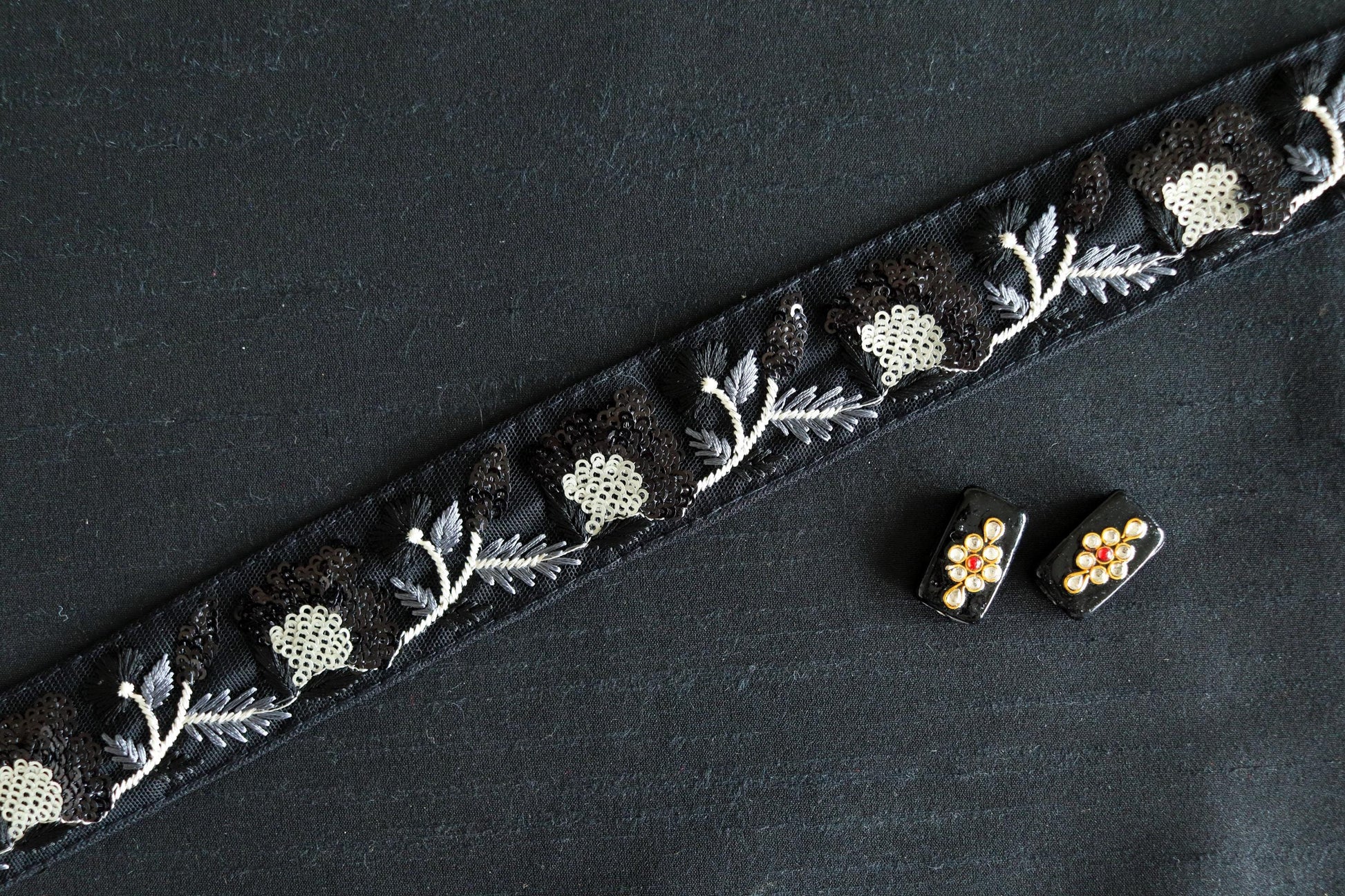 Black Sequin Floral Embroidered Trim, Black Floral Net Border, Floral Sequin Lace, Indian Trim, Black Saree Border, インド刺繍リボン