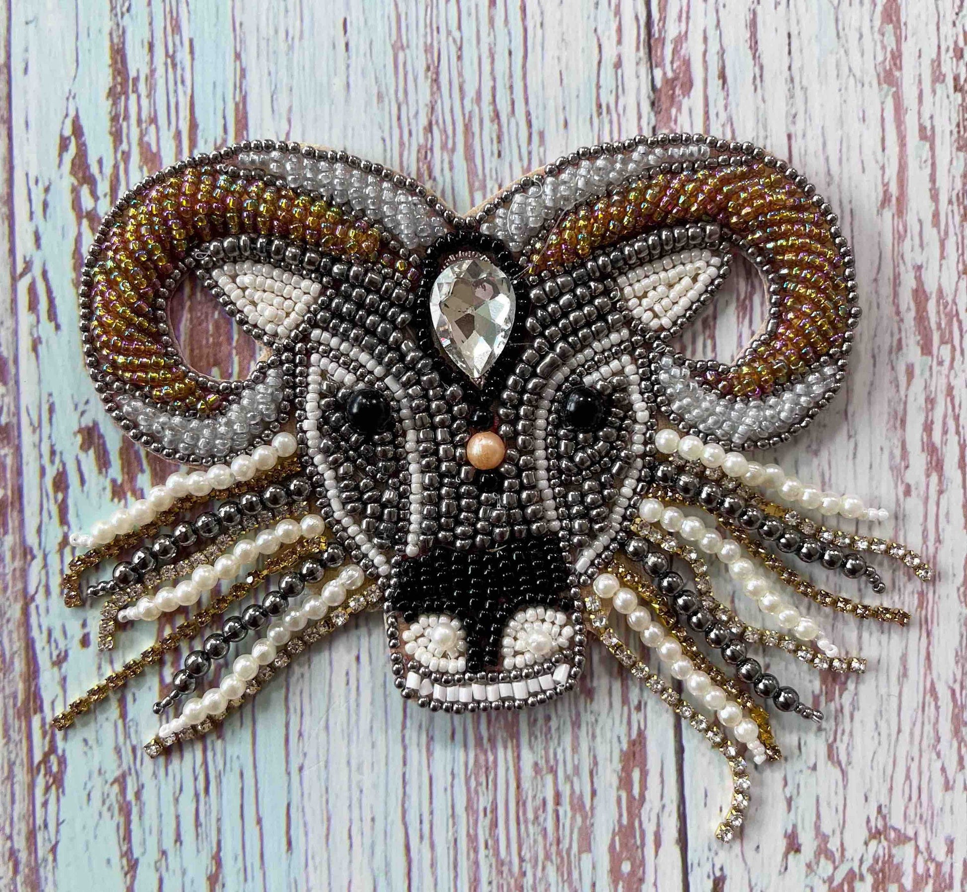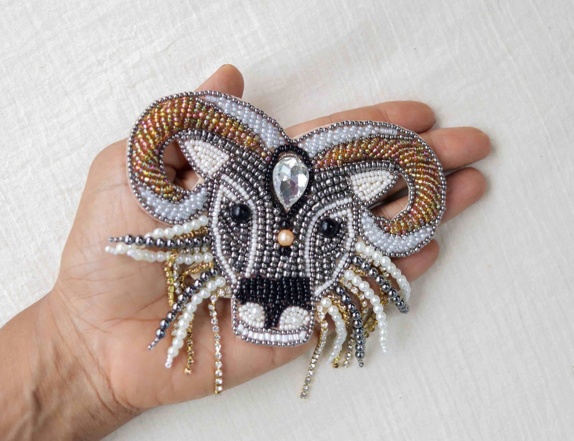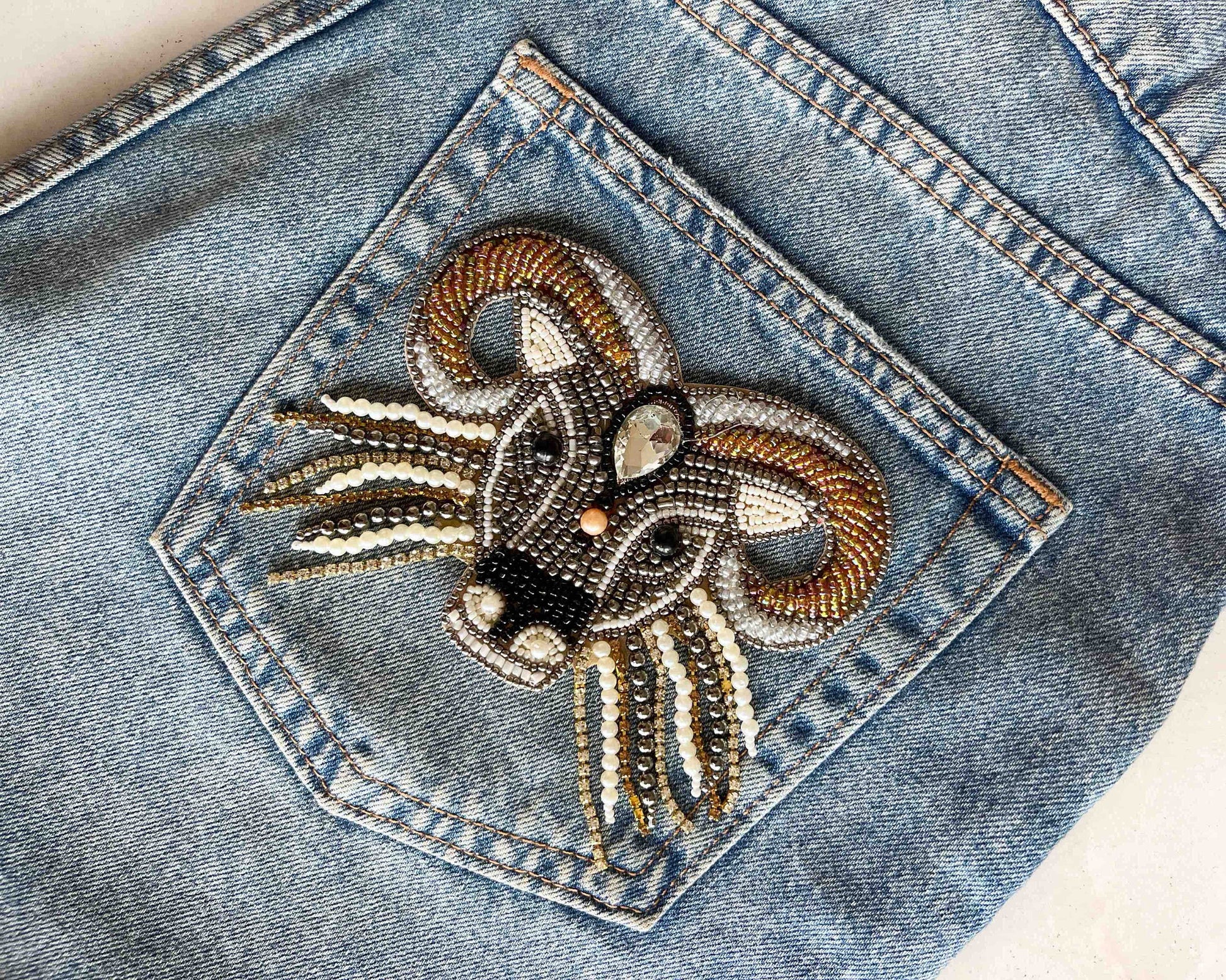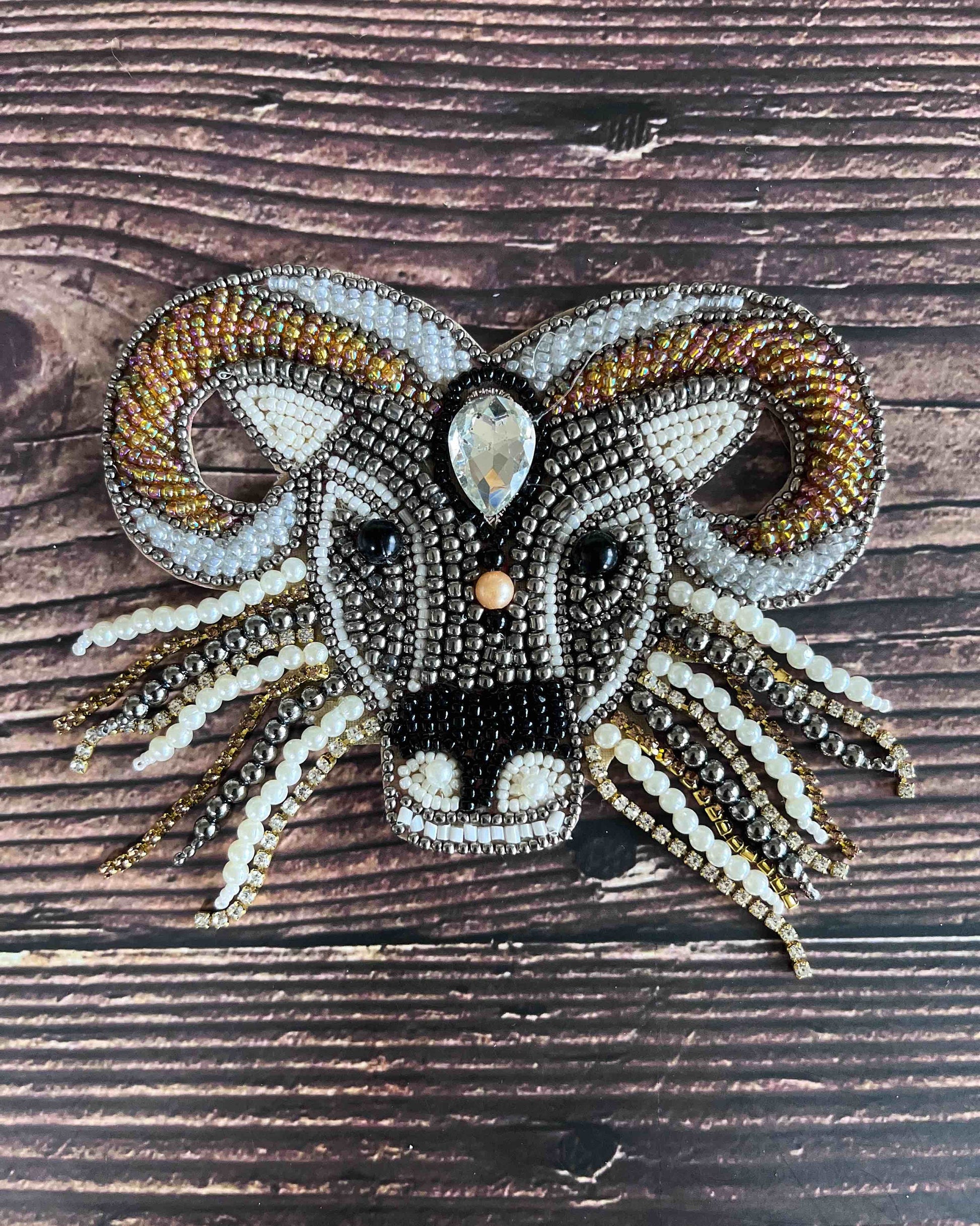 This exquisite bullock patch is handmade with a lot of intricately detailed embroidery. Created with many small elements detailing the various features of the animal. Like the grey, white, gold beads making up the head. The gold beads for the horns. The white pearls making it look even more handsome. And the dangling strings of white and gold diamantes and beads making it irresistible! A bull to bring a truly boho touch to your jacket, or pocket, or bag!