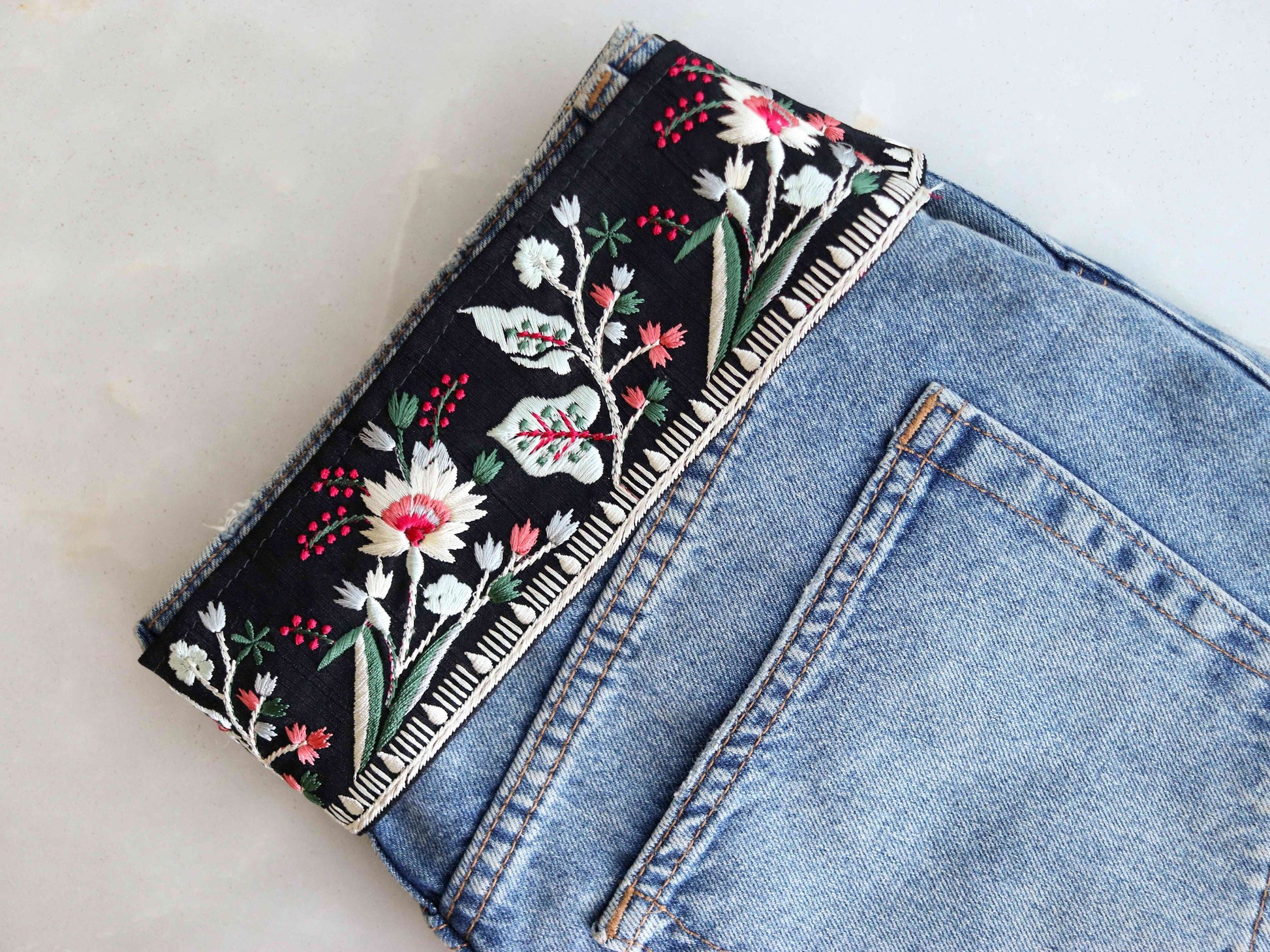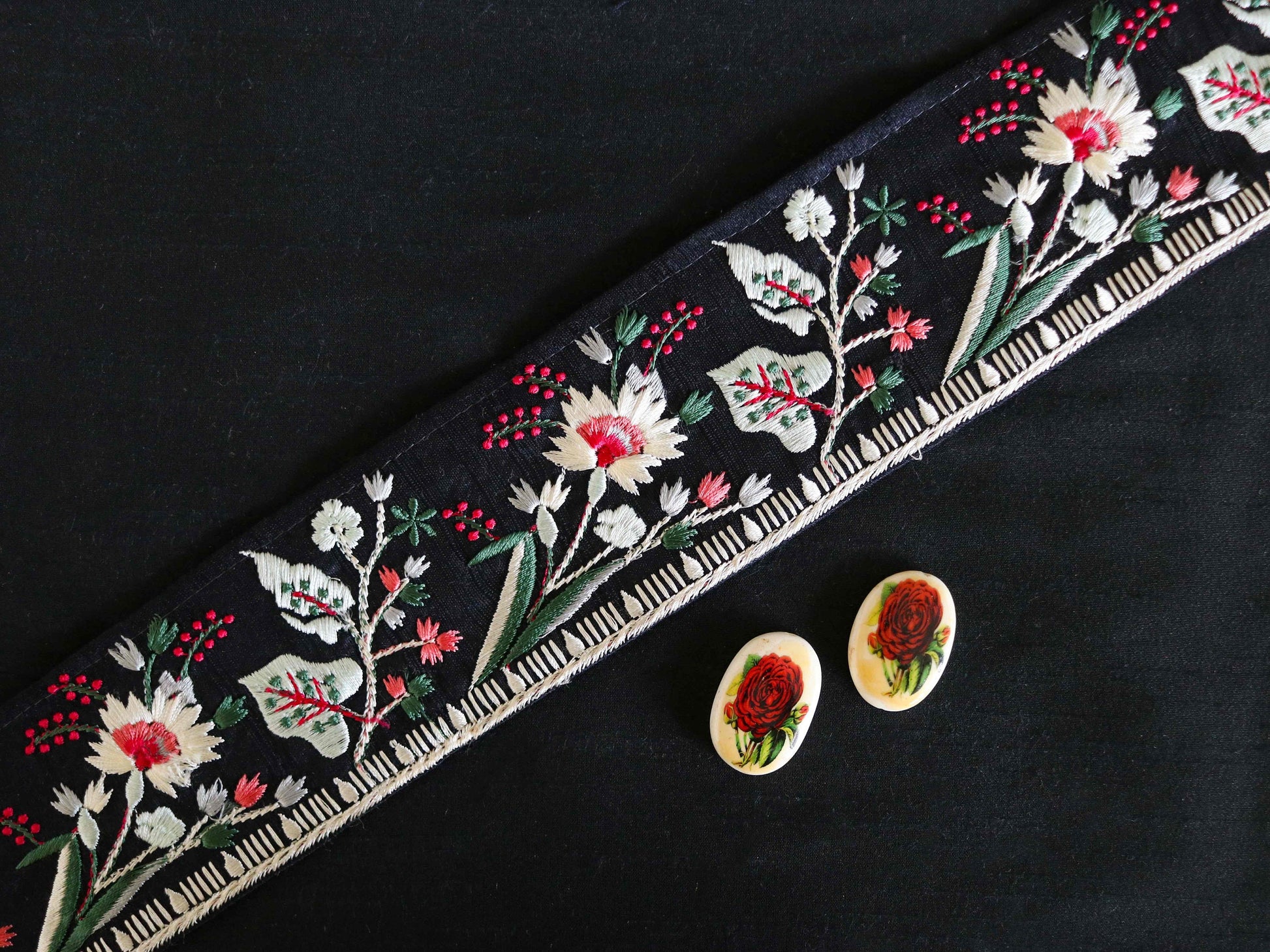 Fabulous florals! Pretty daisies and peonies embroidered in a white, with a dash of pink - on a black cotton fabric. Created in the Parsi style of embroidery, characterised by floral patterns in dense stitches. Make it elegant or boho, style it your way.