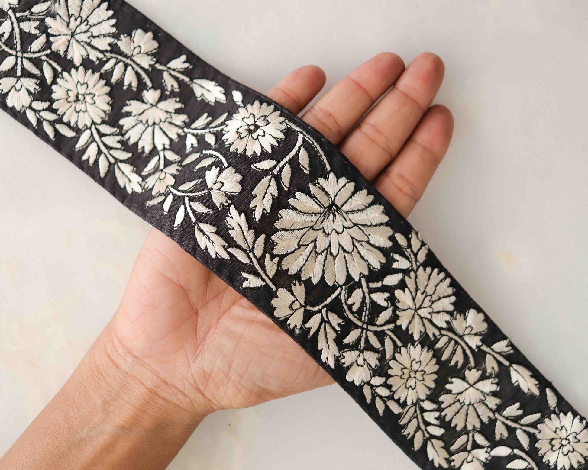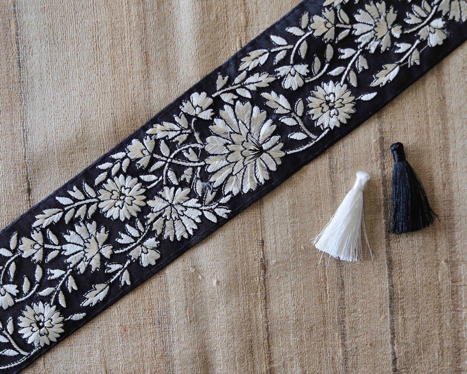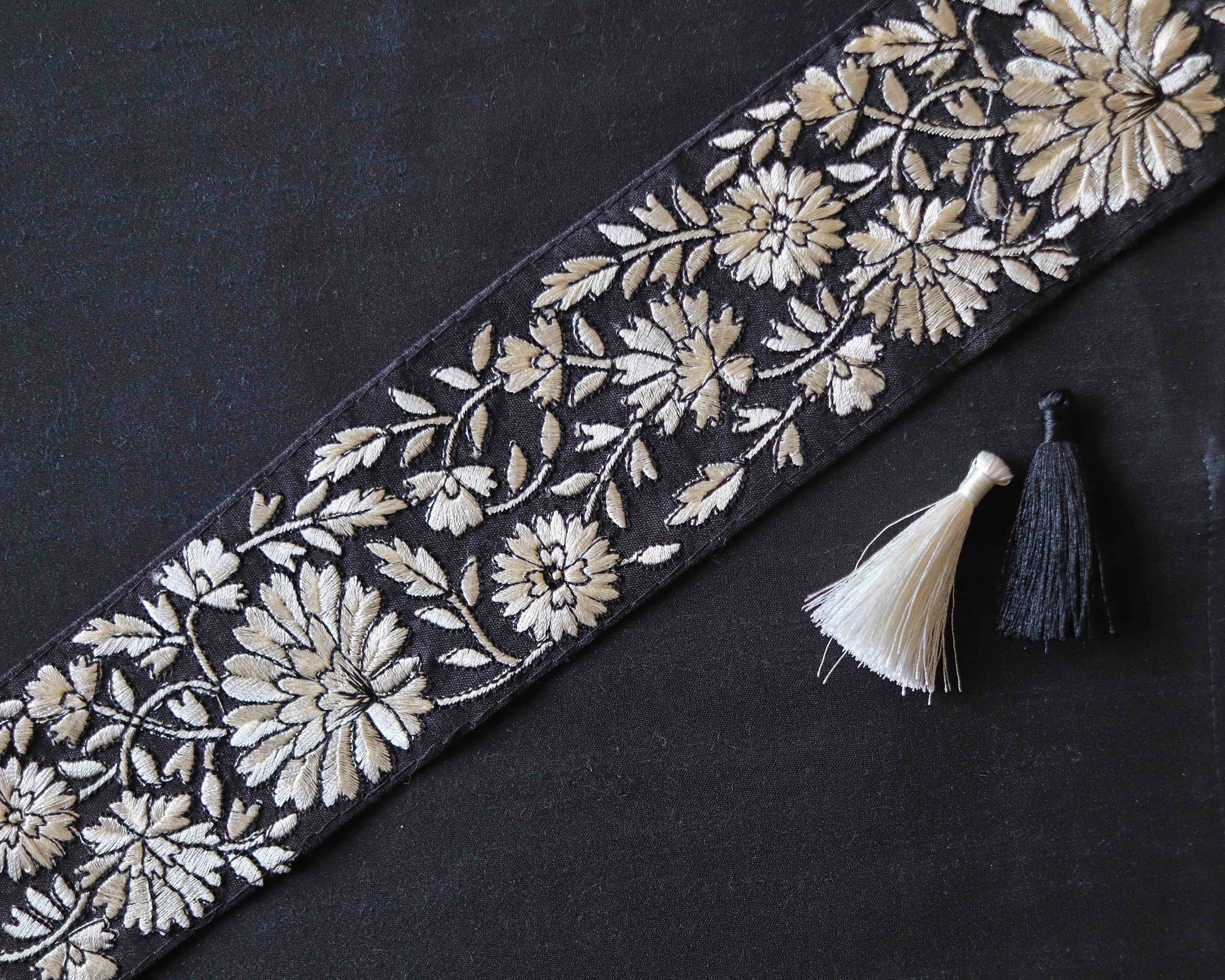 Black White Floral Embroidered Trim,Indian Fabric Floral Border,Royal Black White Broad Paisley Lace,Floral Saree Border,Price/mtr,インド刺繍リボン
