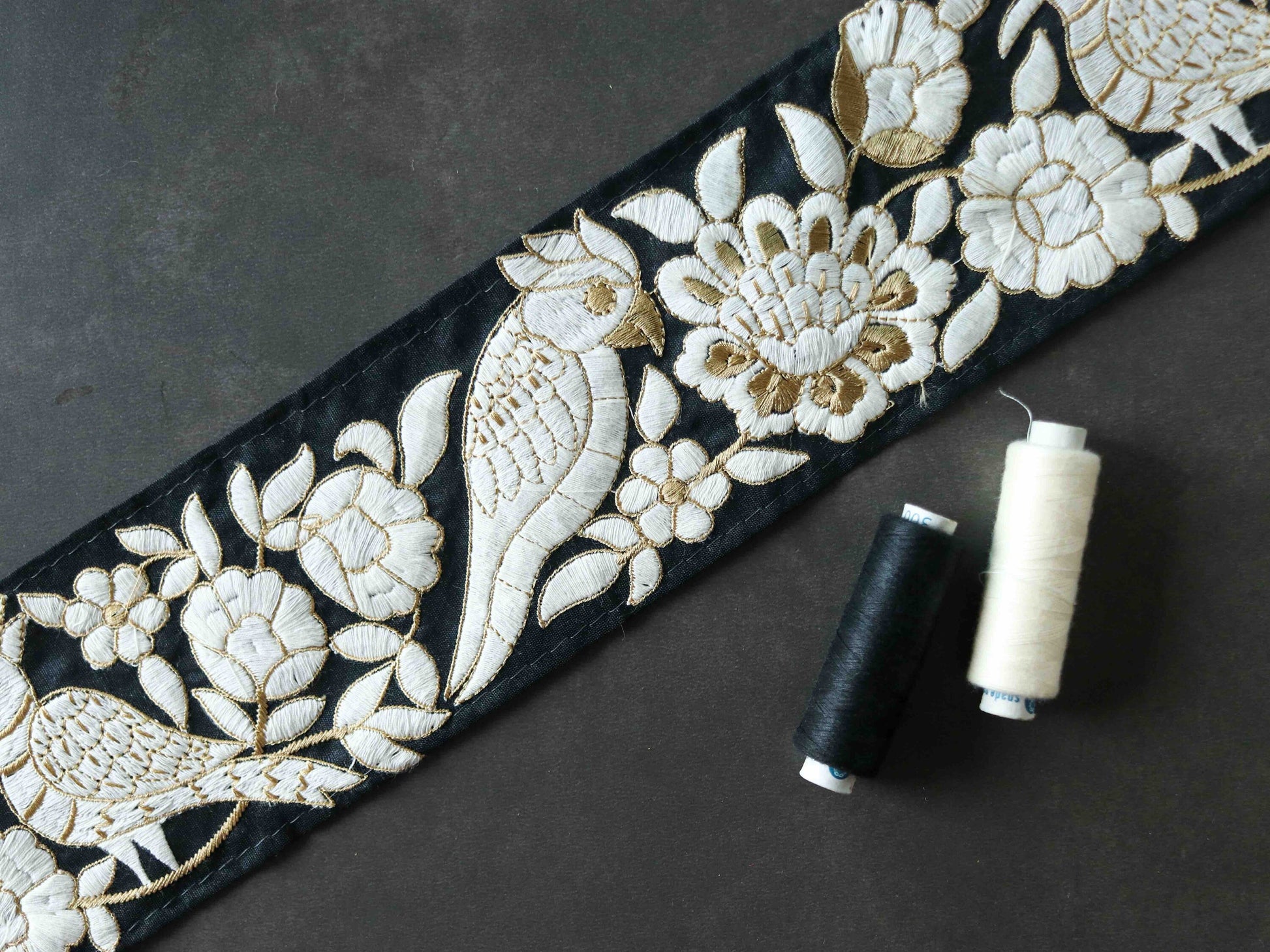 A beautiful trim embroidered with exotic birds and flowers, created with very fine embroidery, in the Parsi style. In white embroidery on black fabric, embellished with gold beige threads. Very elegant and yet quirky!