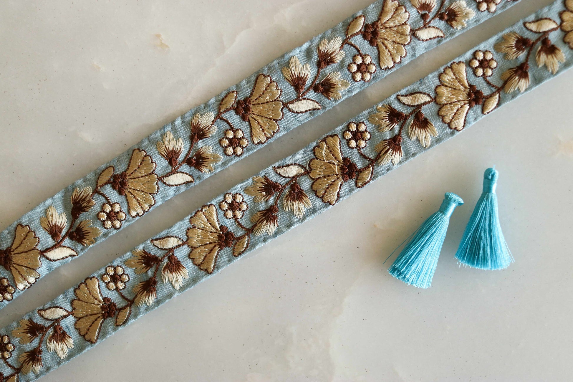 Blue Beige Floral Embroidered Trim,Powder Blue Floral Border,Blue Floral Lace,Indian Fabric Trim,Floral Saree Border,Price/mtr