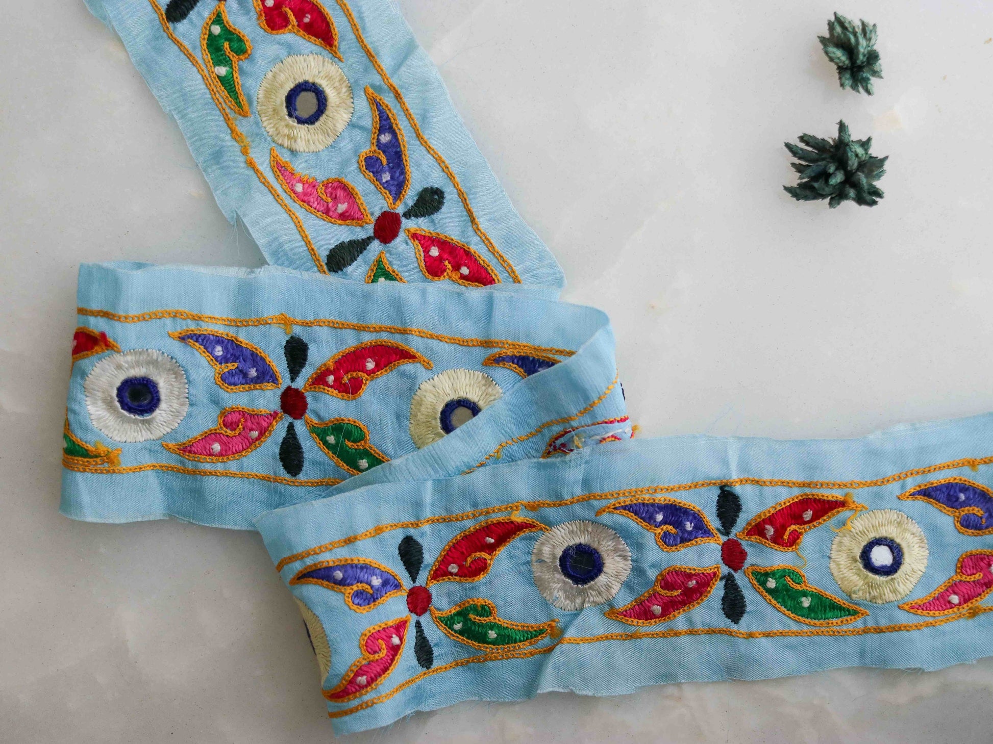 Welcome spring with pretty florals adorning a very delicate looking trim! Cheerful flowers embroidered in red, pink, blue and green, on a light blue silk fabric. Created in the Kutchi style of embroidery that originates from the Gujarat region of India. Embellished with small pieces of mirror to add a bit of glam. Elegant and cheerful at the same time!