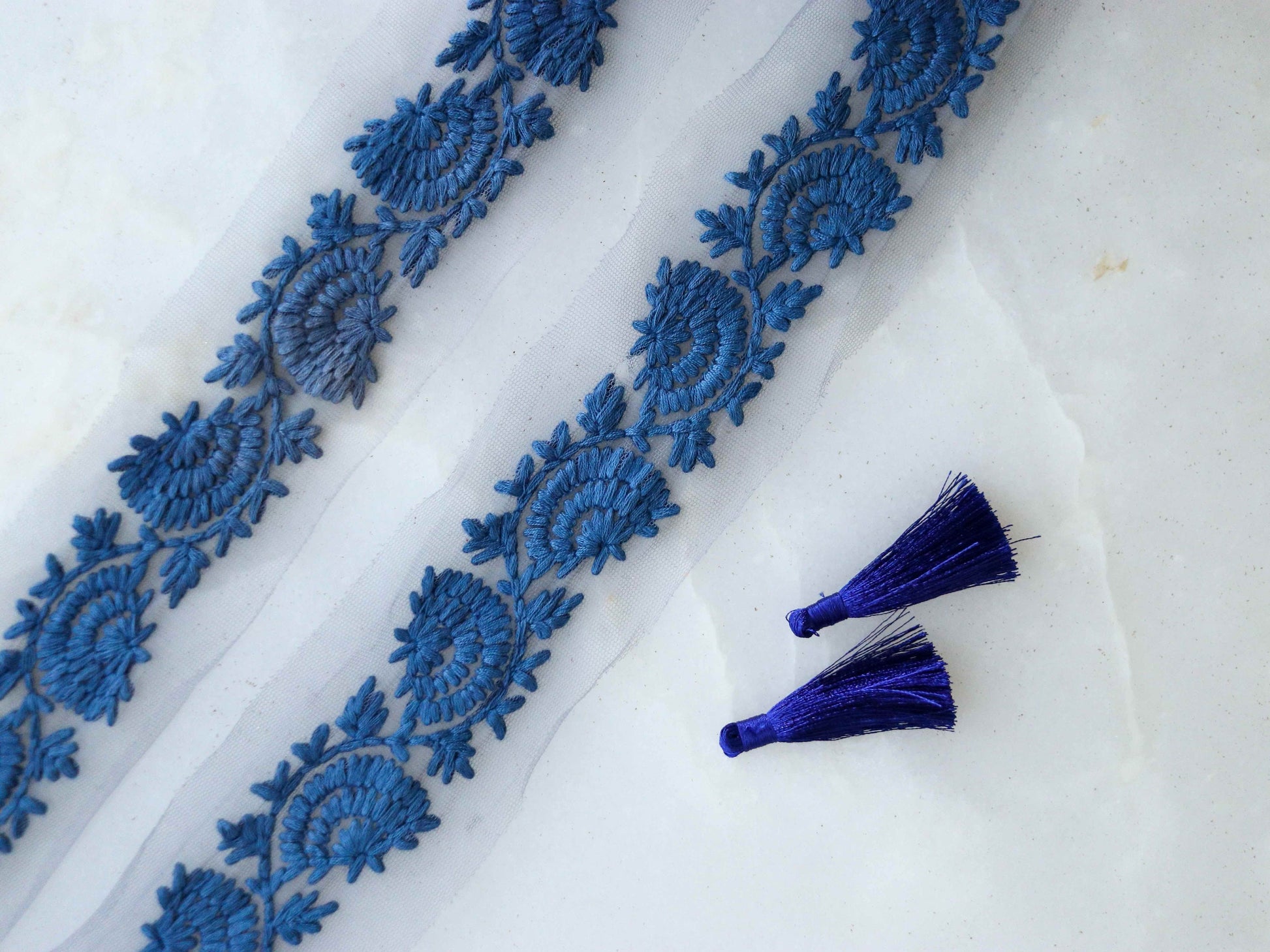 Blue Grey Floral Embroidered Trim,Net Border,Blue Grey Floral Lace,Indian Fabric Trim,Saree Border,Price/mtr