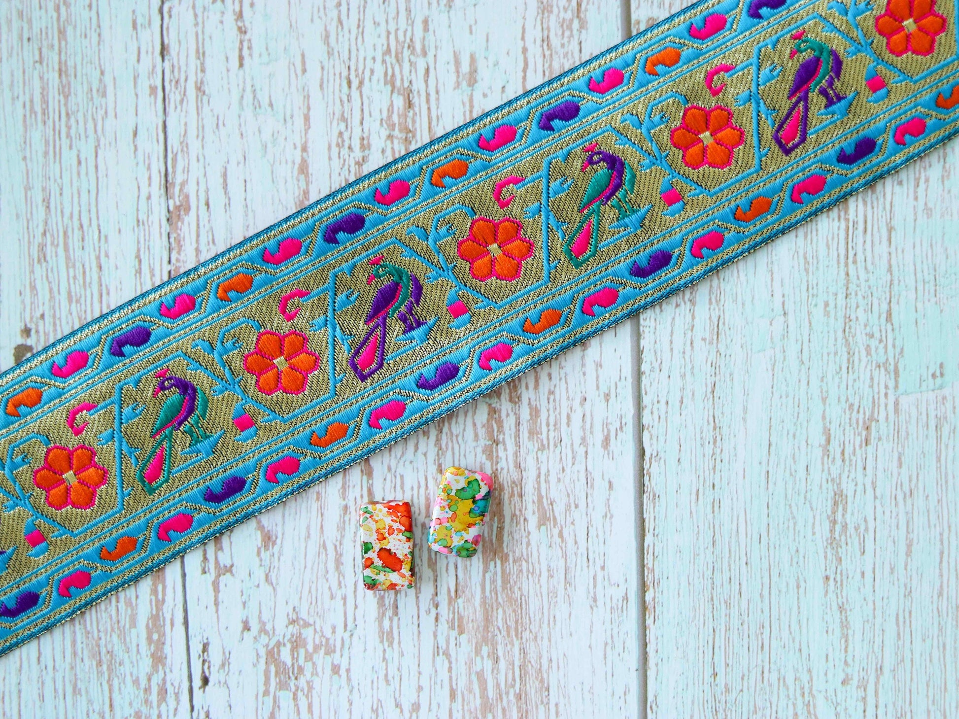 A gorgeous trim created with Banarasi brocade weave. With graceful peacocks woven in purple and blue, along with flowers in orange red. Embellished with a golden weave, on a light blue silk fabric.