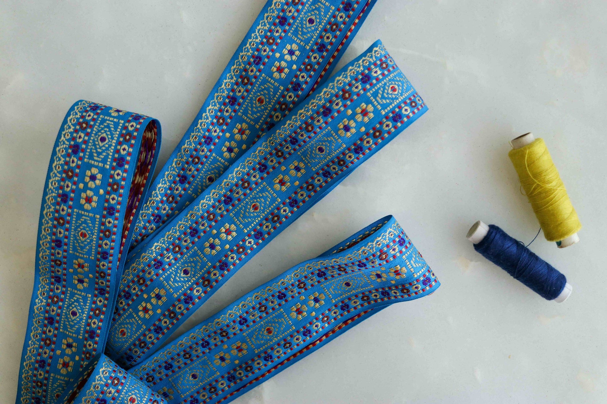 This pretty trim is created with a brocade weave, with a dainty floral motif. Woven in red and yellow threads on to a soft blue fabric. The colour combination and design give a very vintage and boho look to the trim. And to any project you use it on.