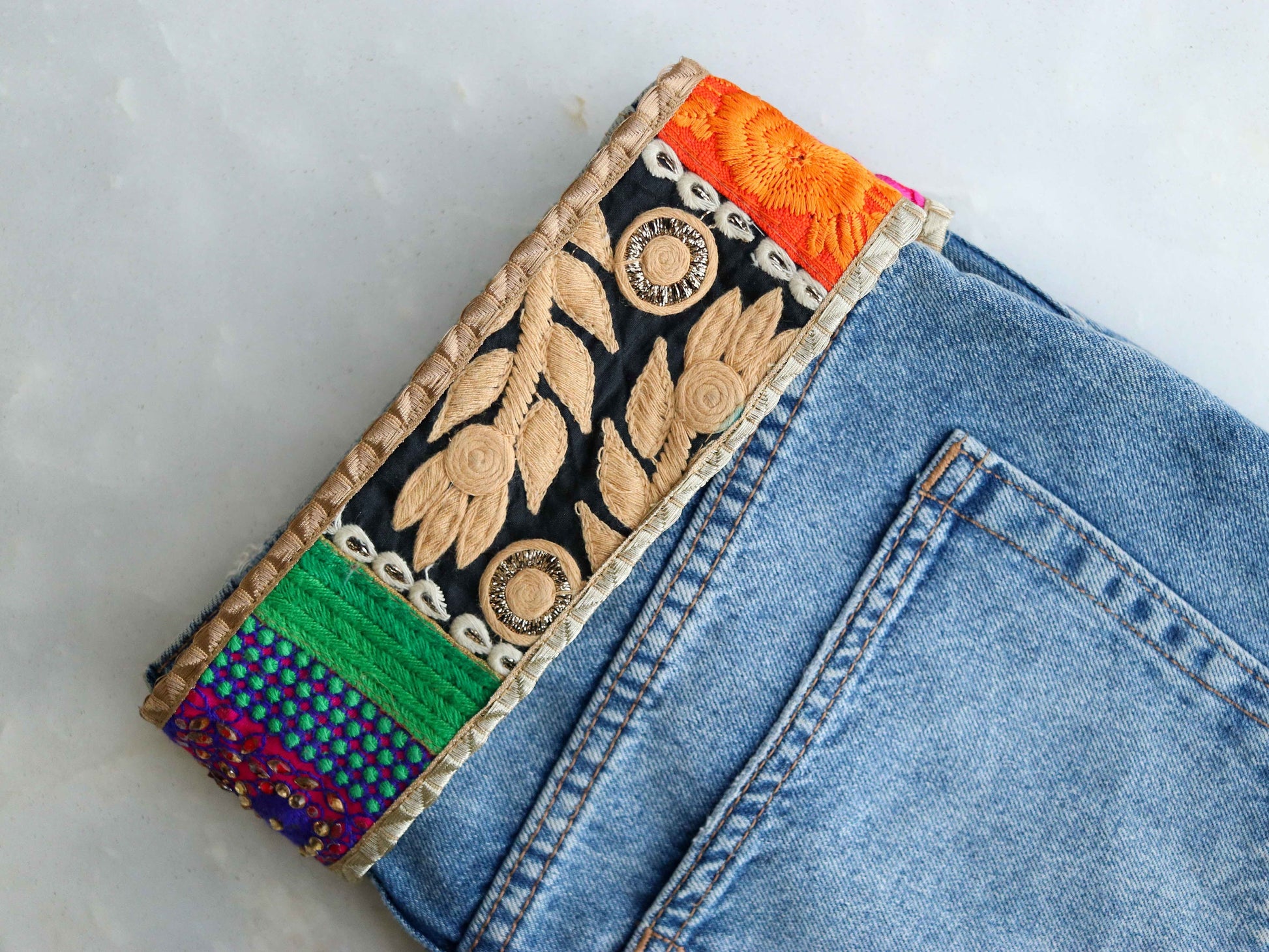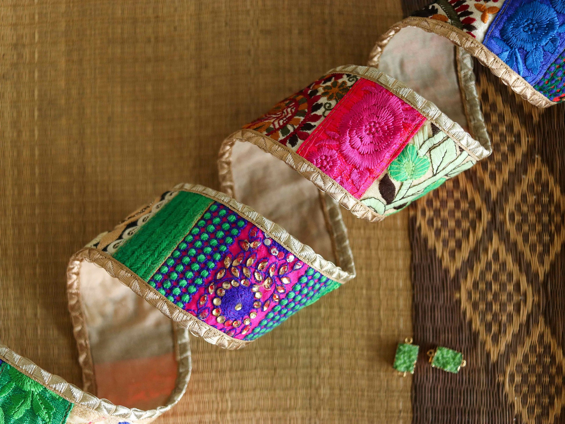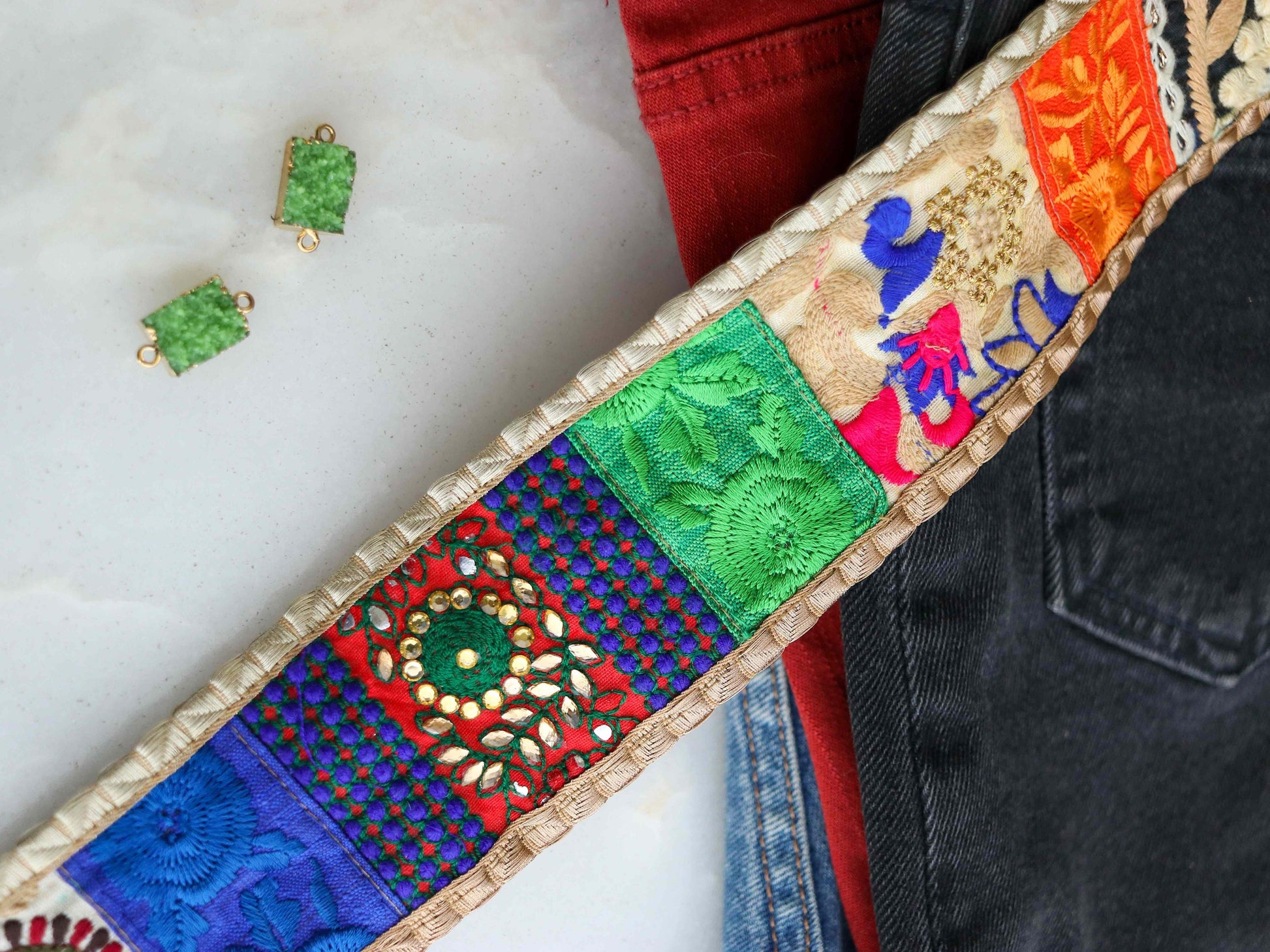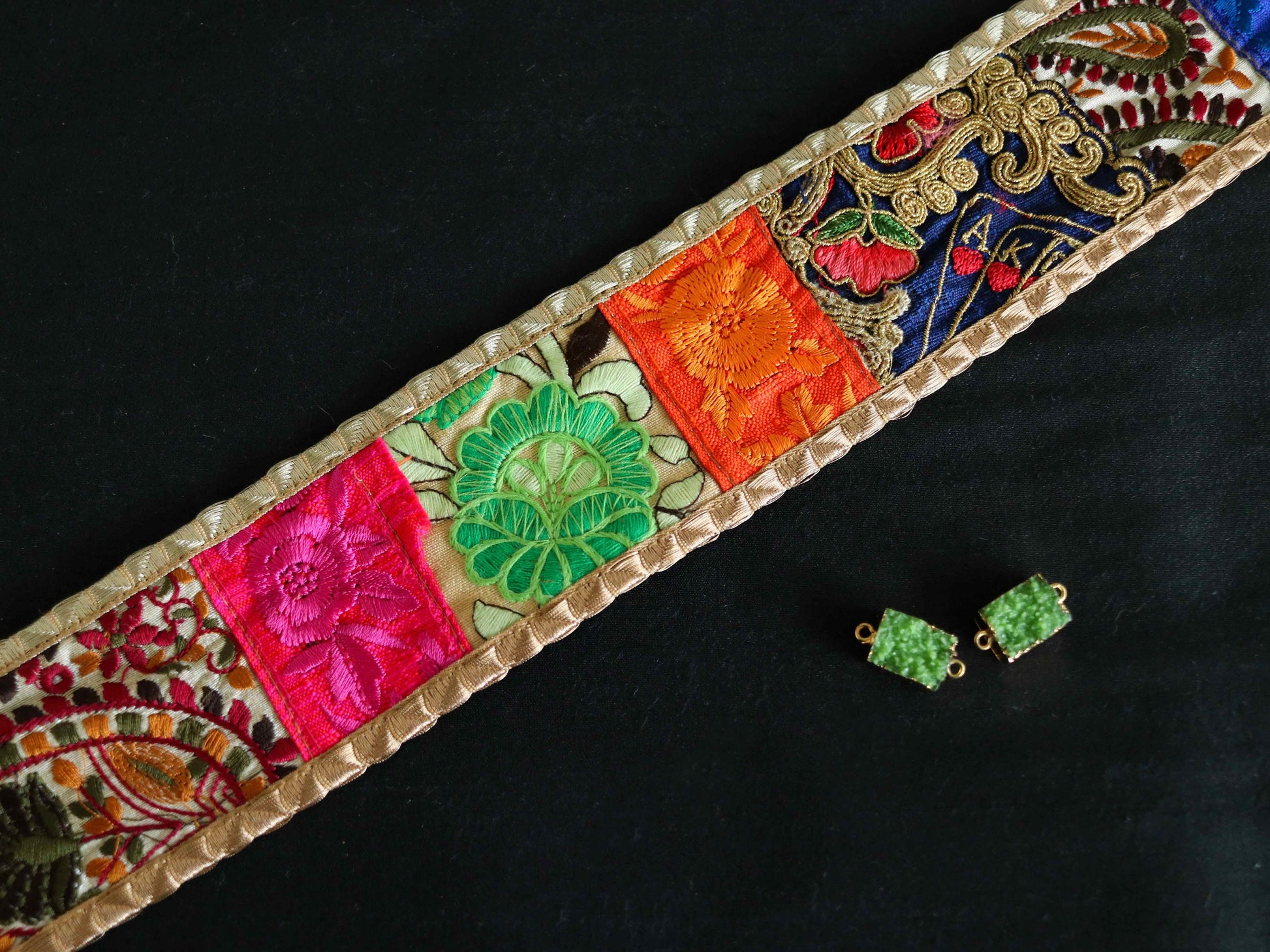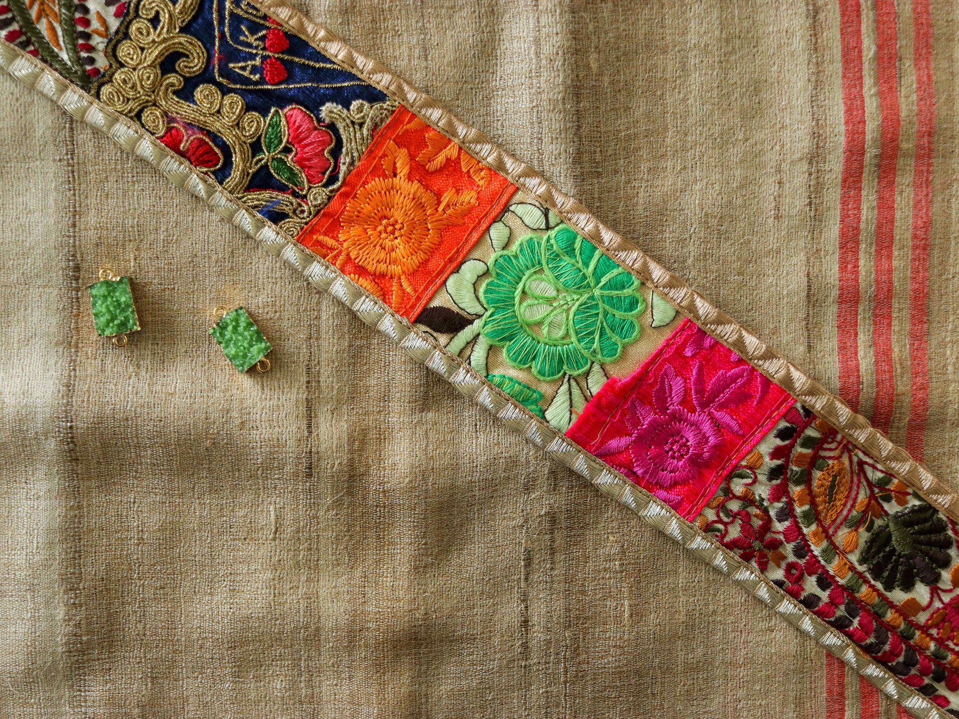 An upcycled trim, made of many small leftover, pre-loved pretty trims. Recycled from many vintage sarees and lehengas, dresses and kurtas. Delicately embroidered in various vibrant colours, and gold zari, beads, diamantes, sequins. Edged with a soft beige gold fabric that makes it look very lively. Delicate to look at, exquisite to use !