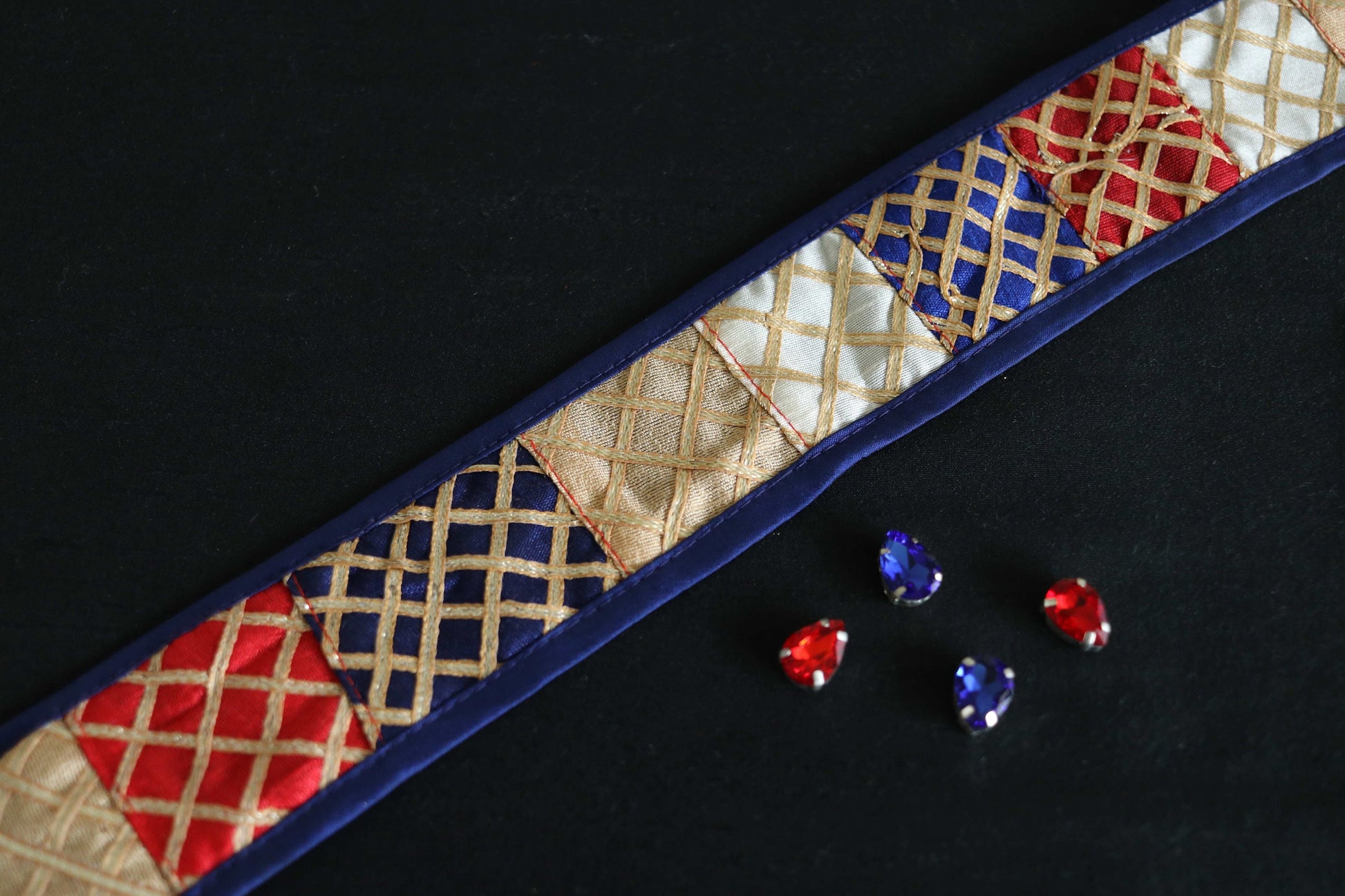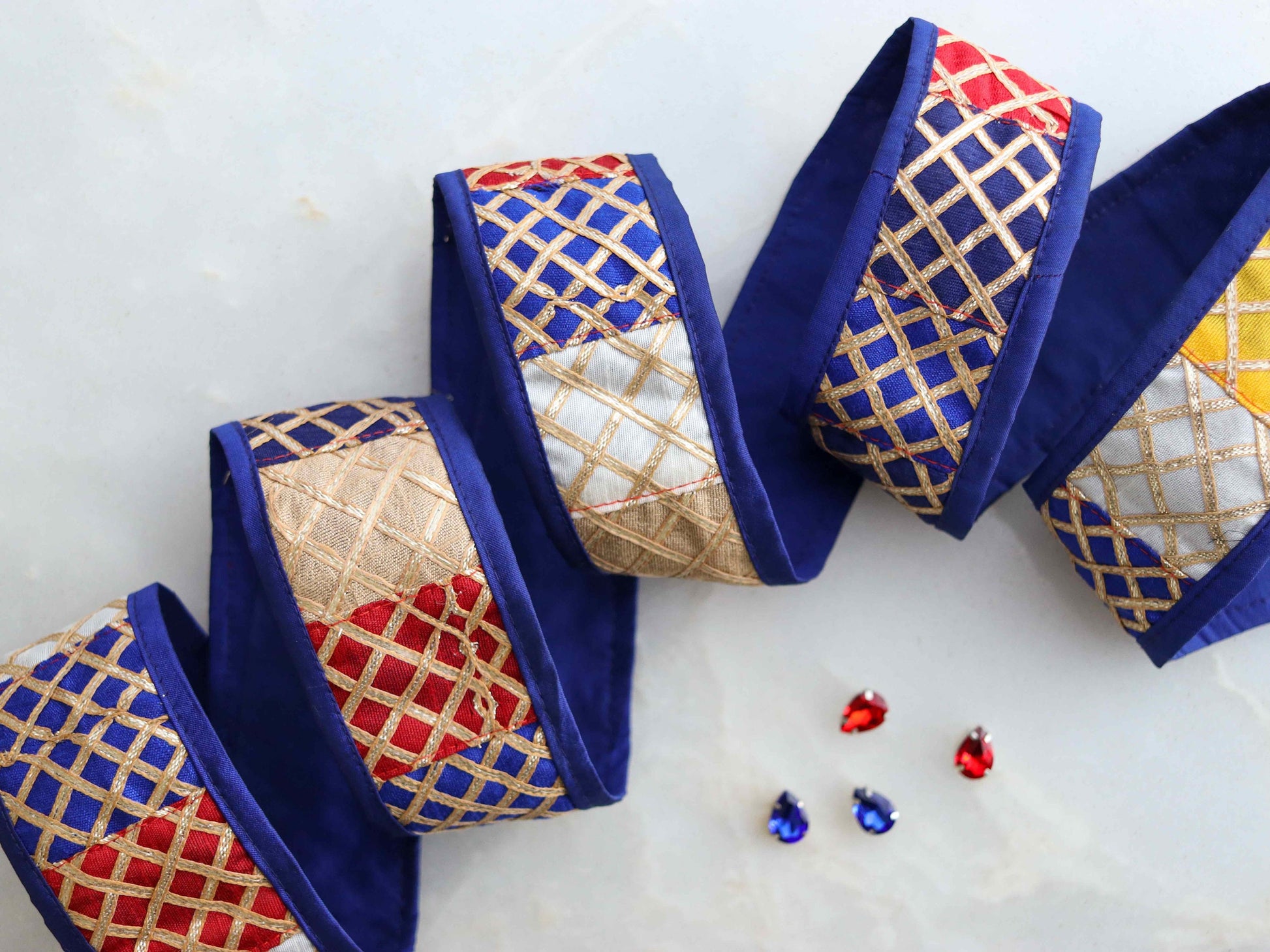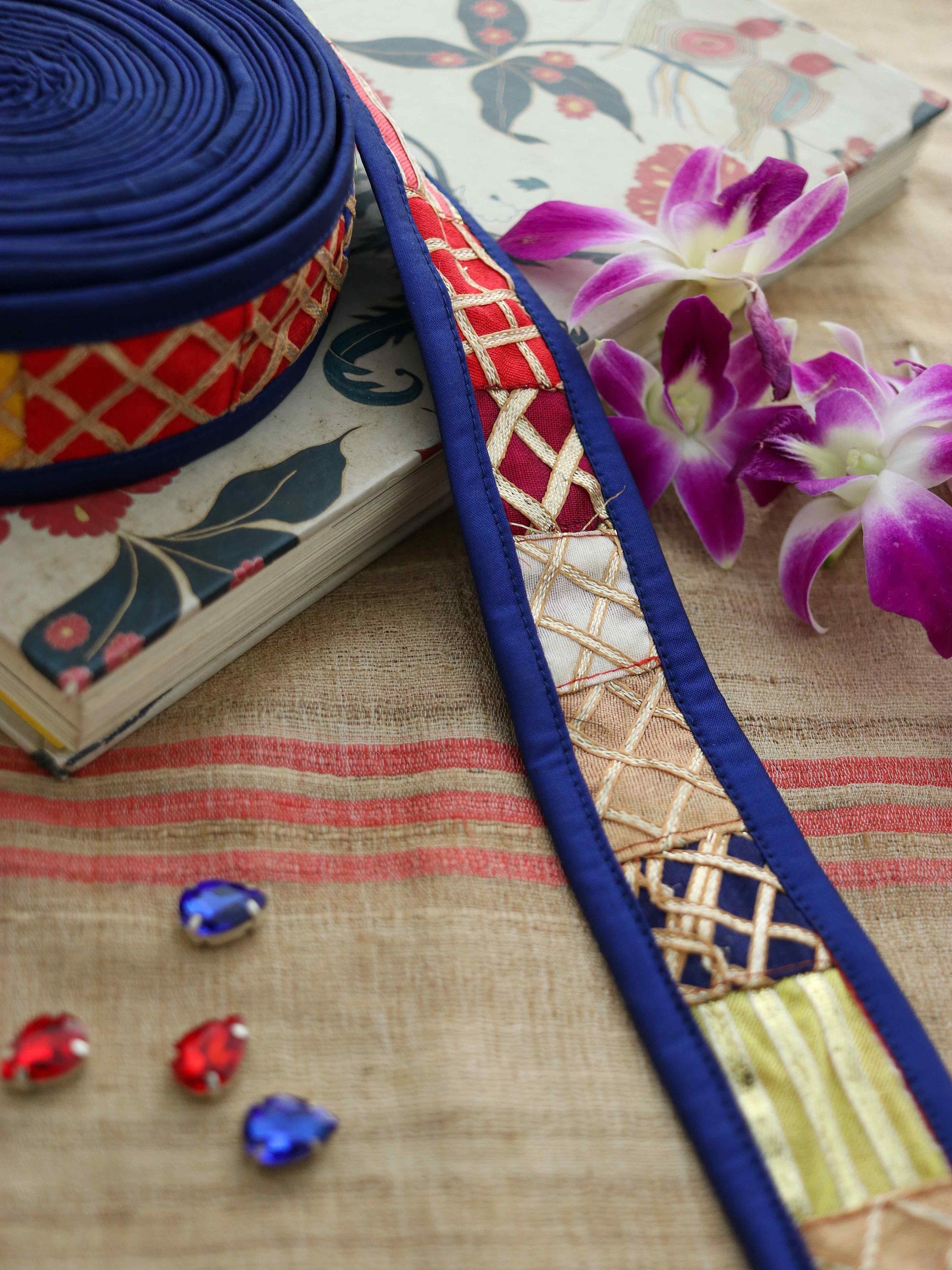 An upcycled trim, made of many small leftover, pre-loved pretty trims. Recycled from many vintage sarees and lehengas, dresses and kurtas. Delicately embroidered with thin gota pattis (strips of gold foil trim) on various vibrant colours. Edged with bright blue fabric that makes it look very lively. Delicate to look at, exquisite to use !