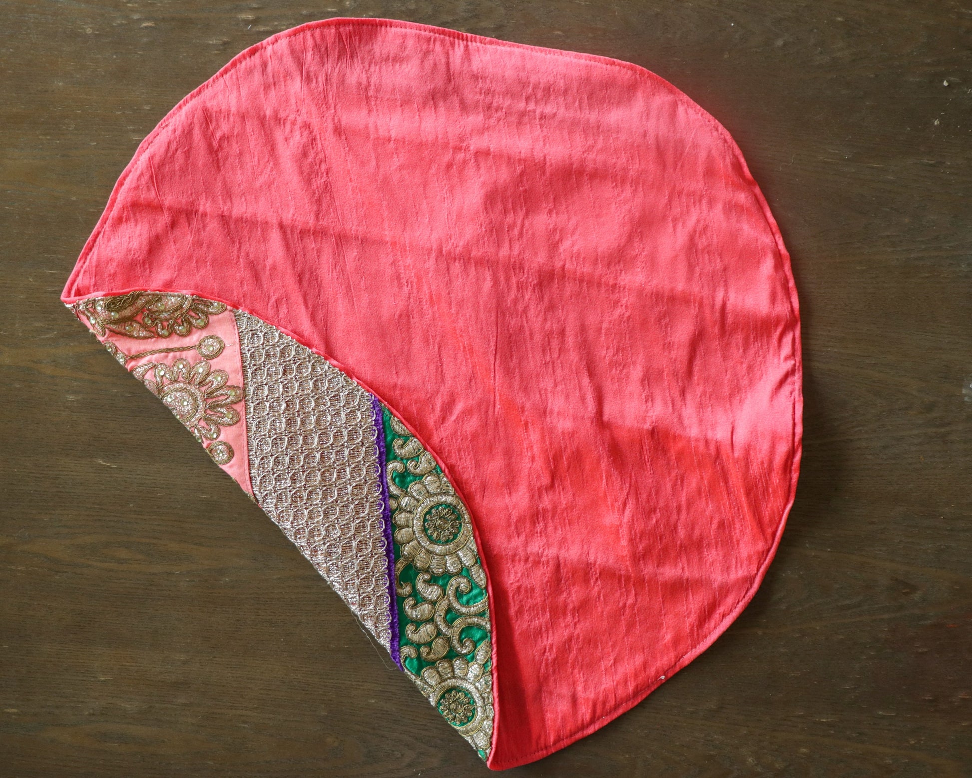 These boho, handmade table mats are made by upcycling bits of pretty trims and borders from old vintage sarees and lehengas. Sewn together to create a unique medley of designs. Finished with a complimenting fabric at the back, to make the piece more sturdy. So you can use it as a placemat, table mat, or as a centre piece for décor. Or simply hang it on the wall as a mini tapestry to bring drama to your room.