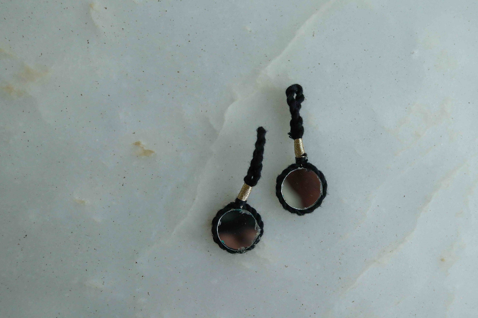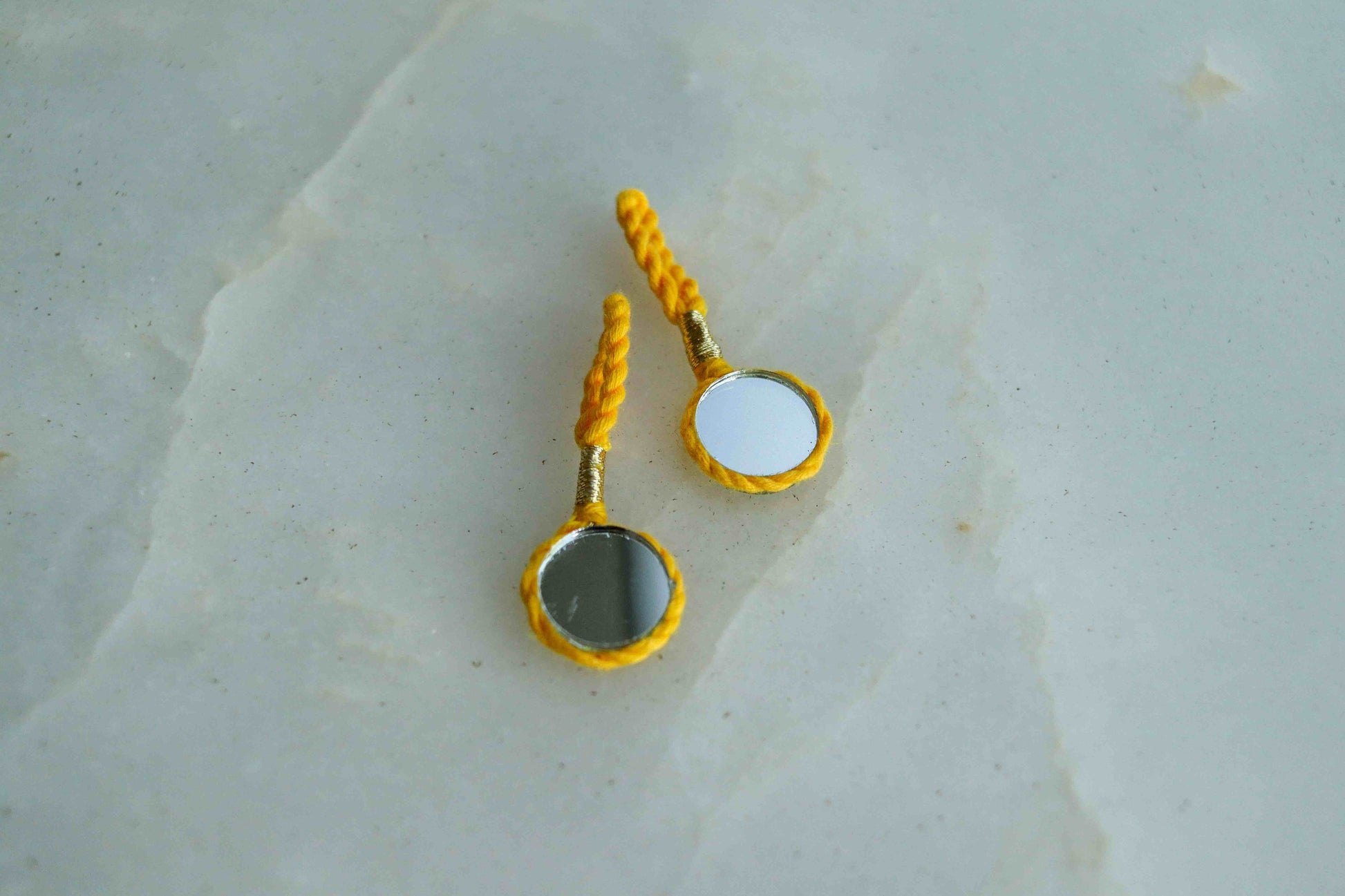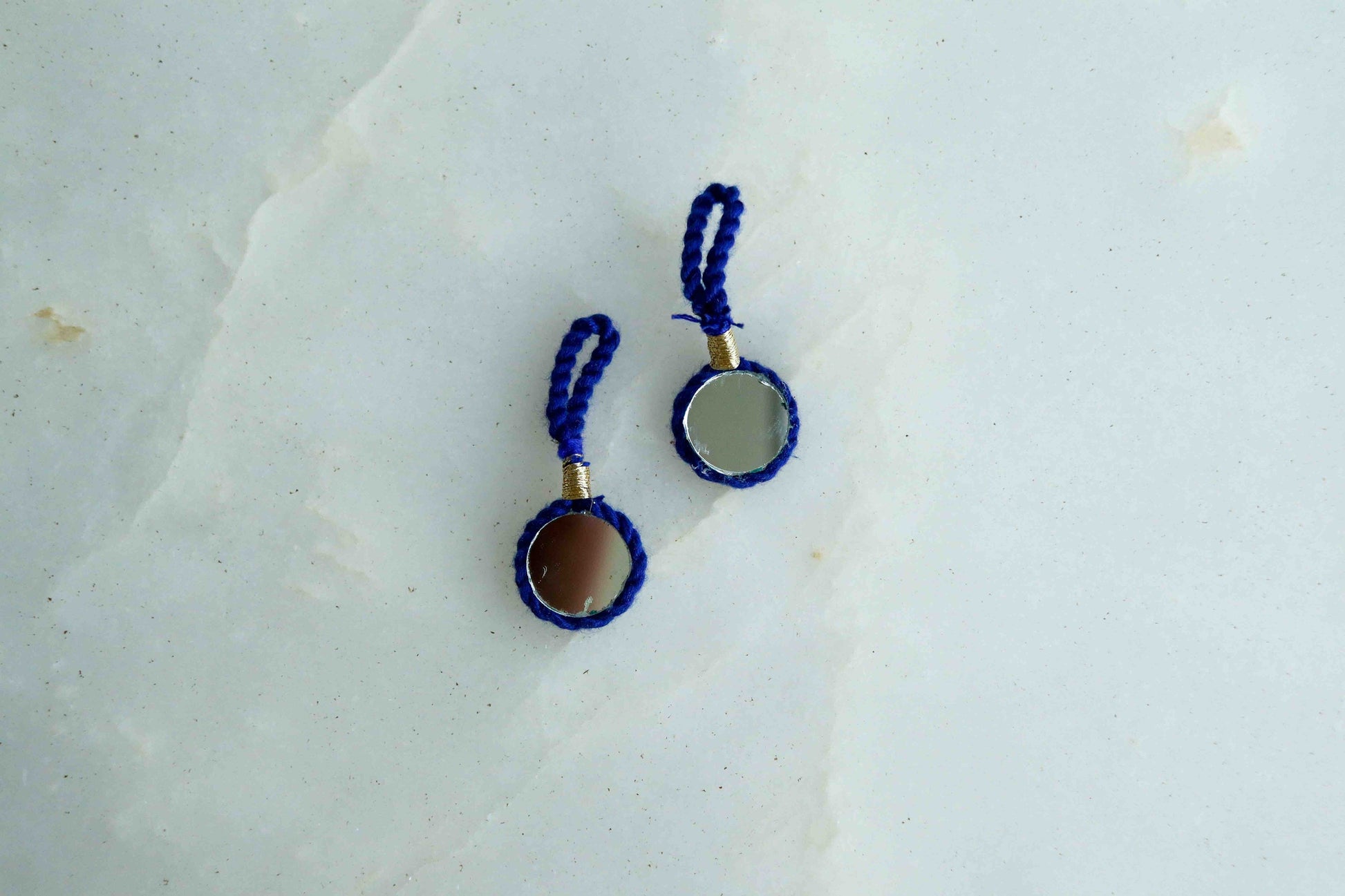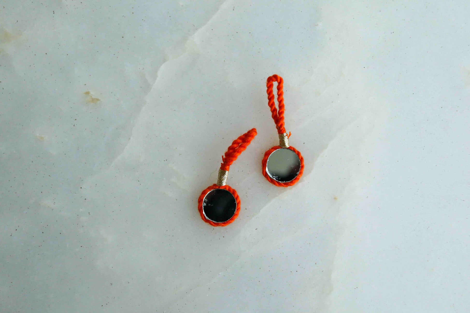 A very boho charm, handmade with woollen strands in bright, vibrant colours. With a large mirror at the centre as the centre of attraction. Strung by woollen threads braided together. Tribal and boho, will get you set for any fest!