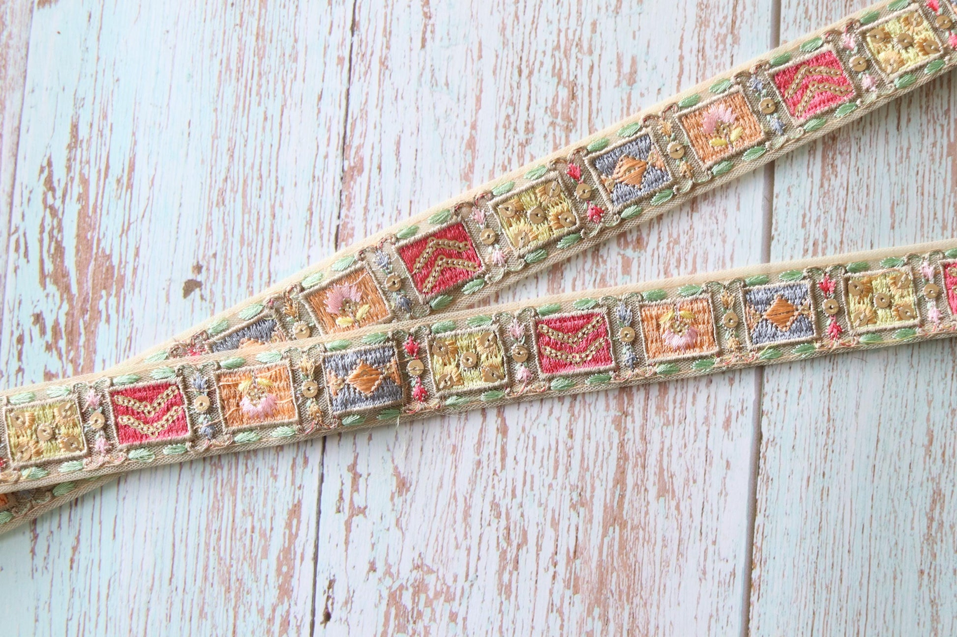 Boho Pastel Patchwork Embroidered Trim, Colourful Gold Zari Sequin Border, Square Patchwork Lace, Indian Saree Border, インド刺繍リボン