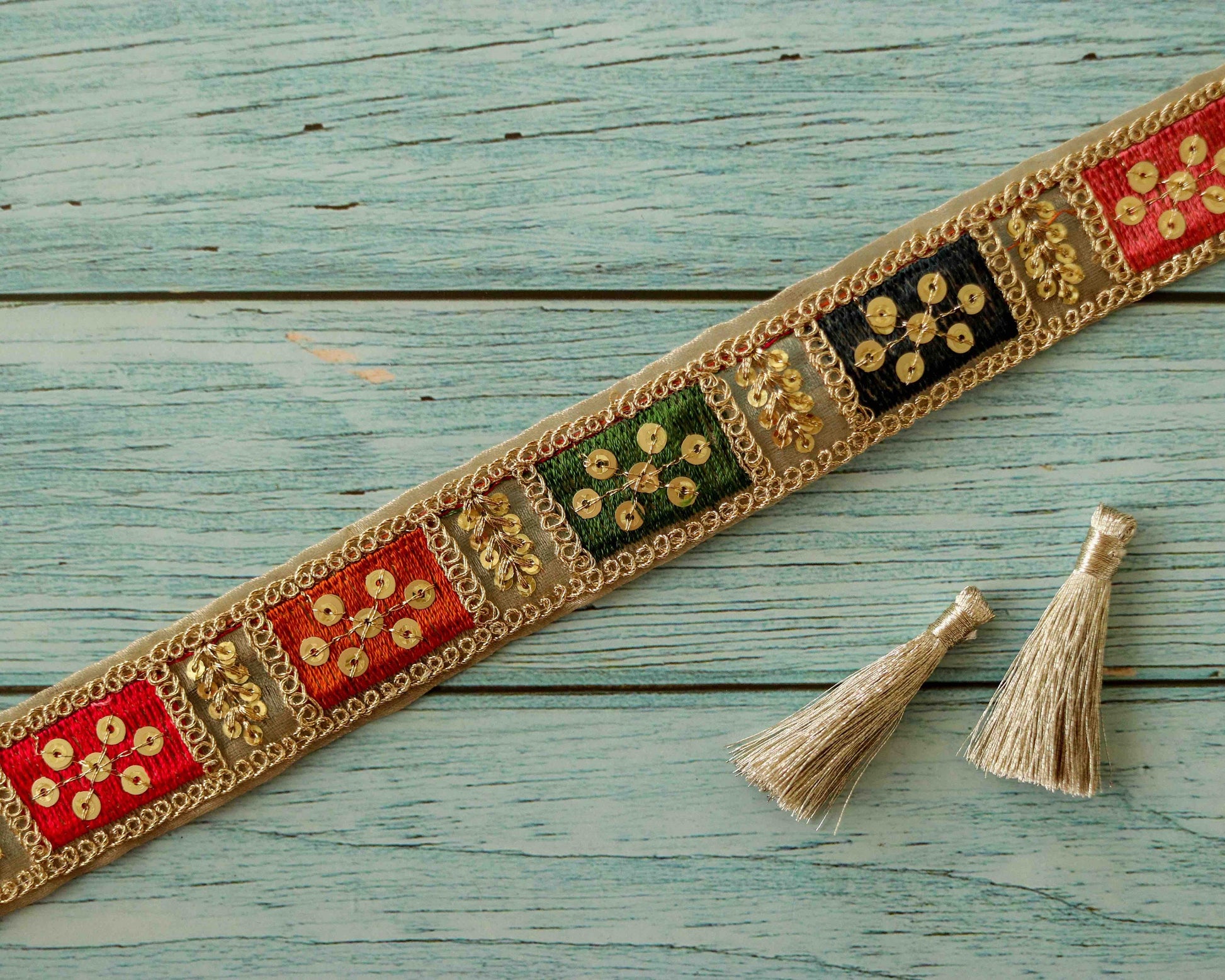 Boho Pastel Patchwork Embroidered Trim,Colourful Gold Zari Sequin Tissue Border,Square Patchwork Lace,Indian Saree Border,Price/mtr