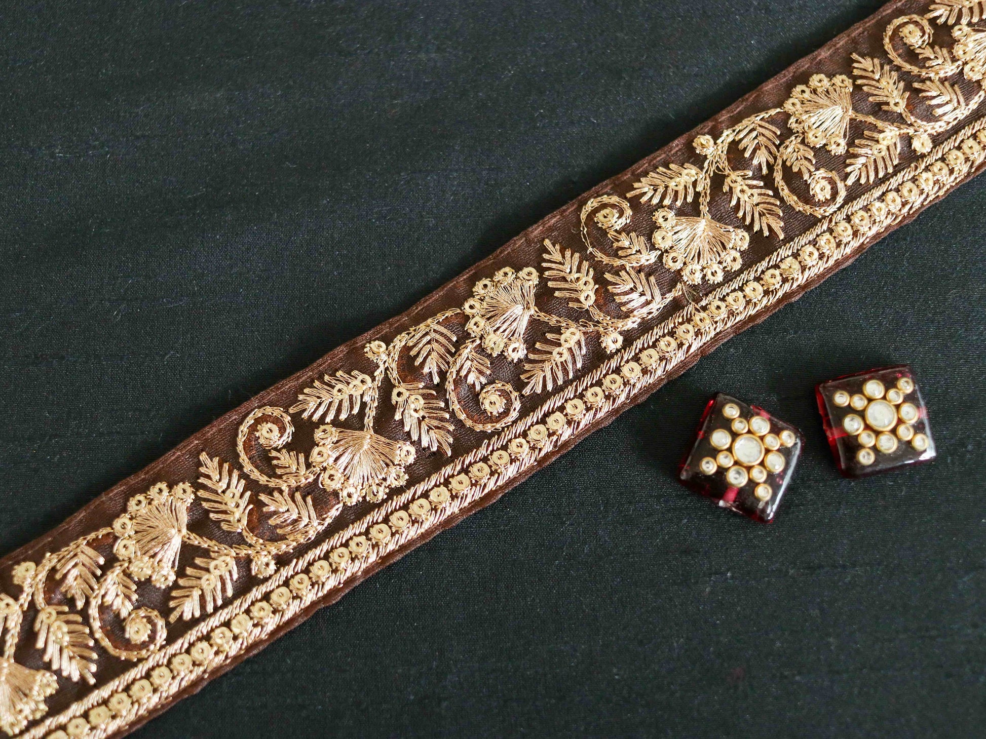 A gorgeous trim delicately embroidered with flowers. With gold zari and small sequins, on a rich chocolate brown organza tissue fabric. Very dressy and elegant !