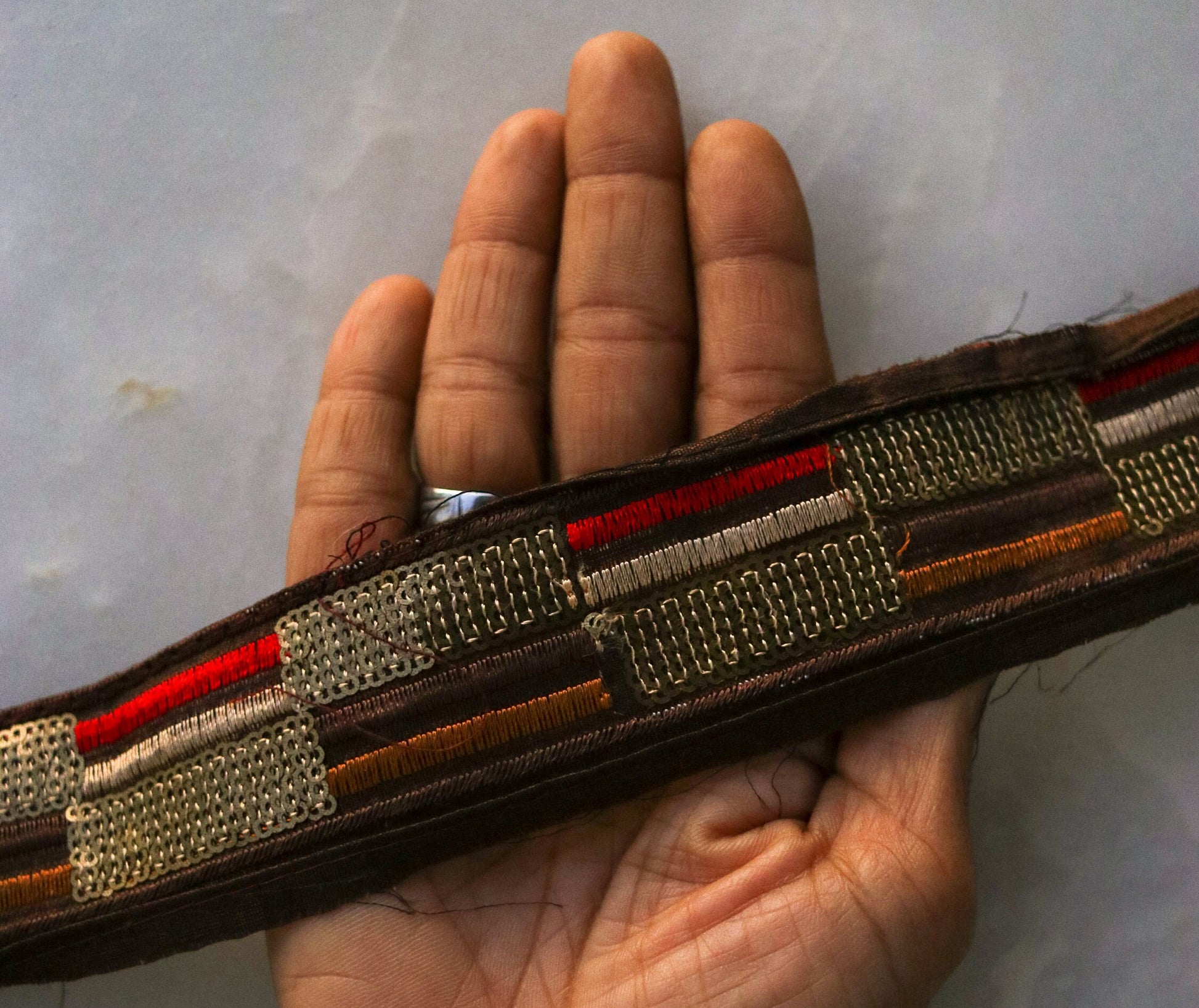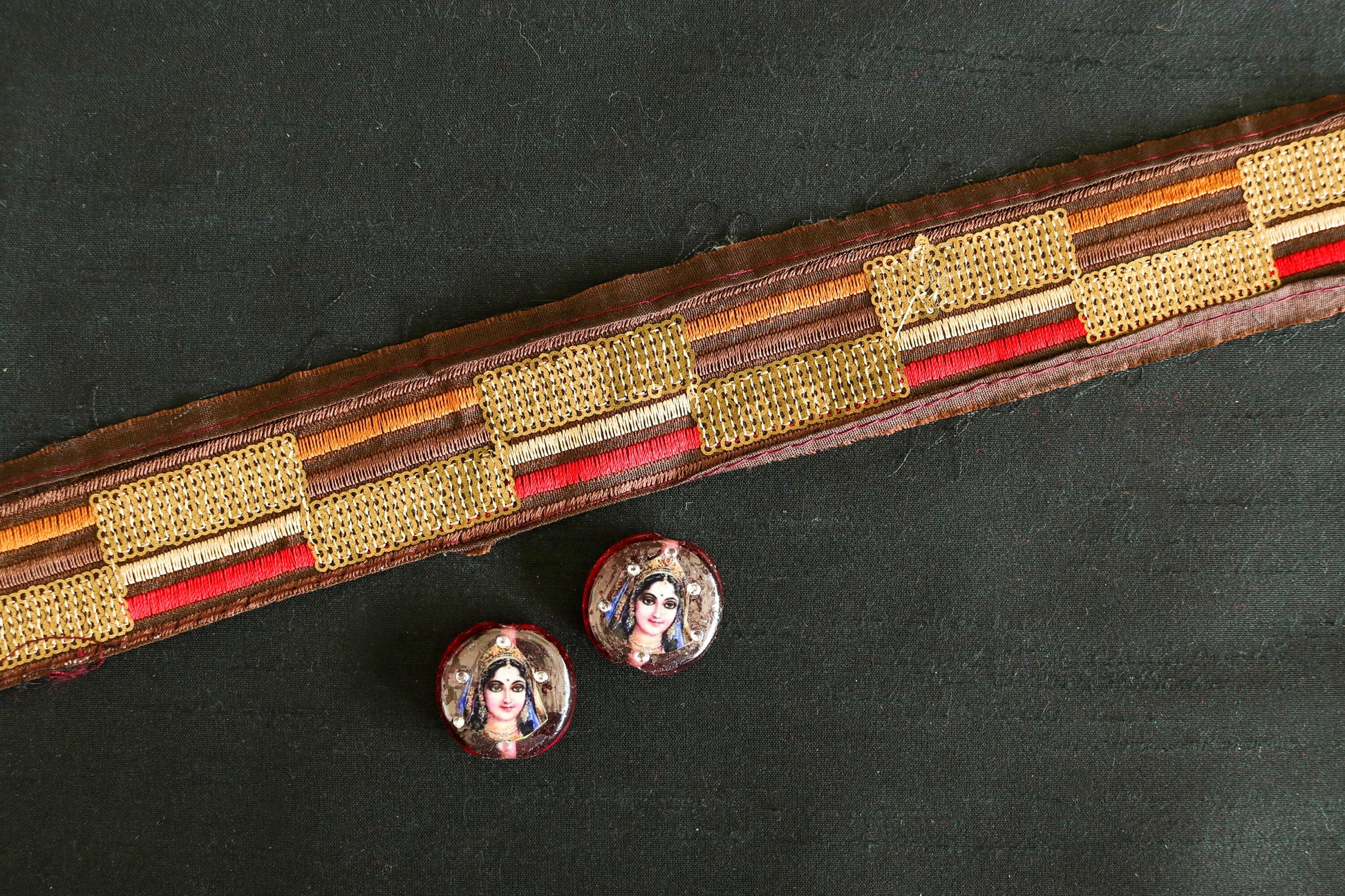 A very vintage looking trim, with soft muted colours. With a striped pattern created on dark brown, with small dashes of colour in red, beige, brown and ochre yellow. And embellished with rows of tiny light gold sequins. Understated elegance, in a very antique style.