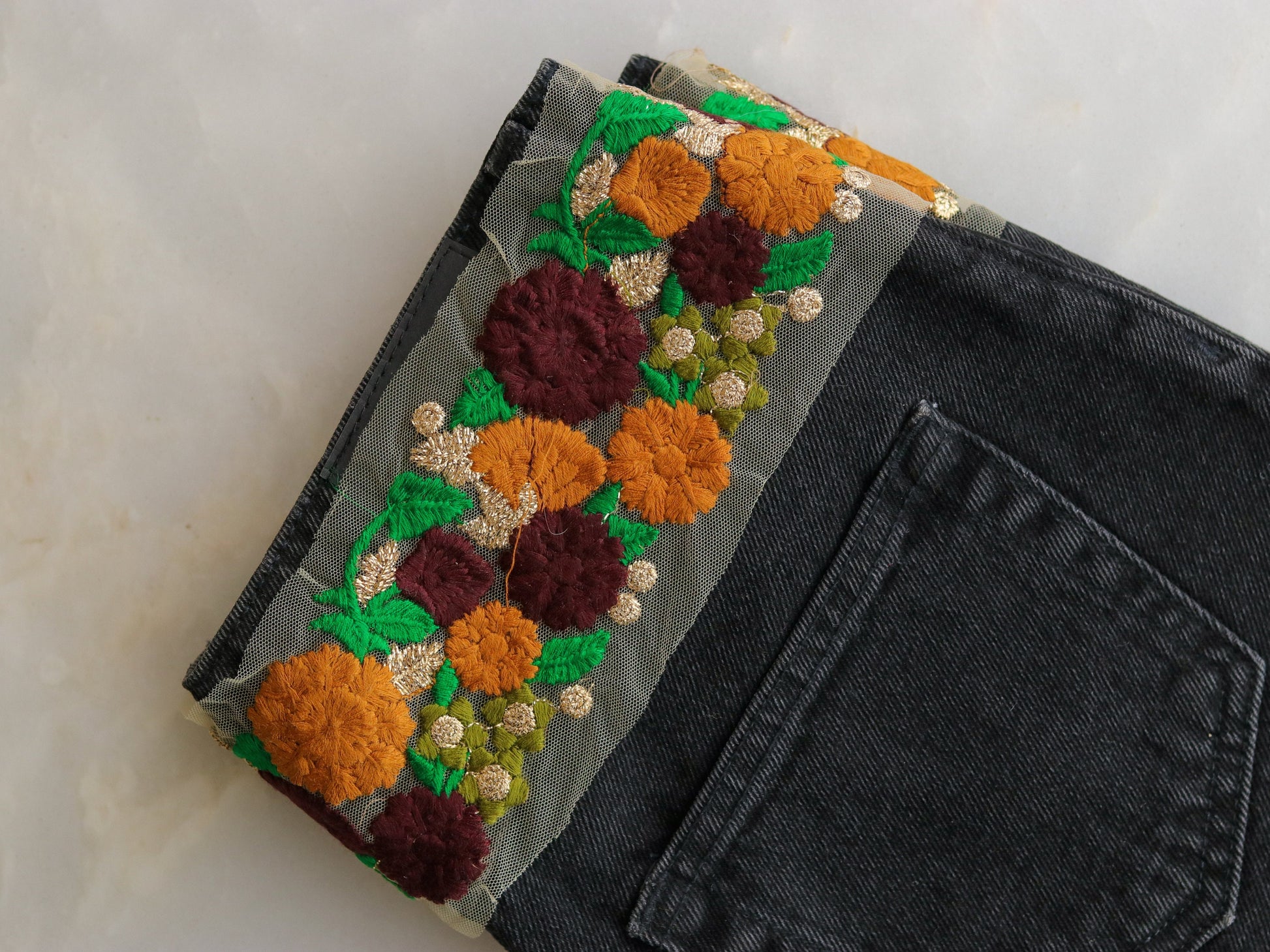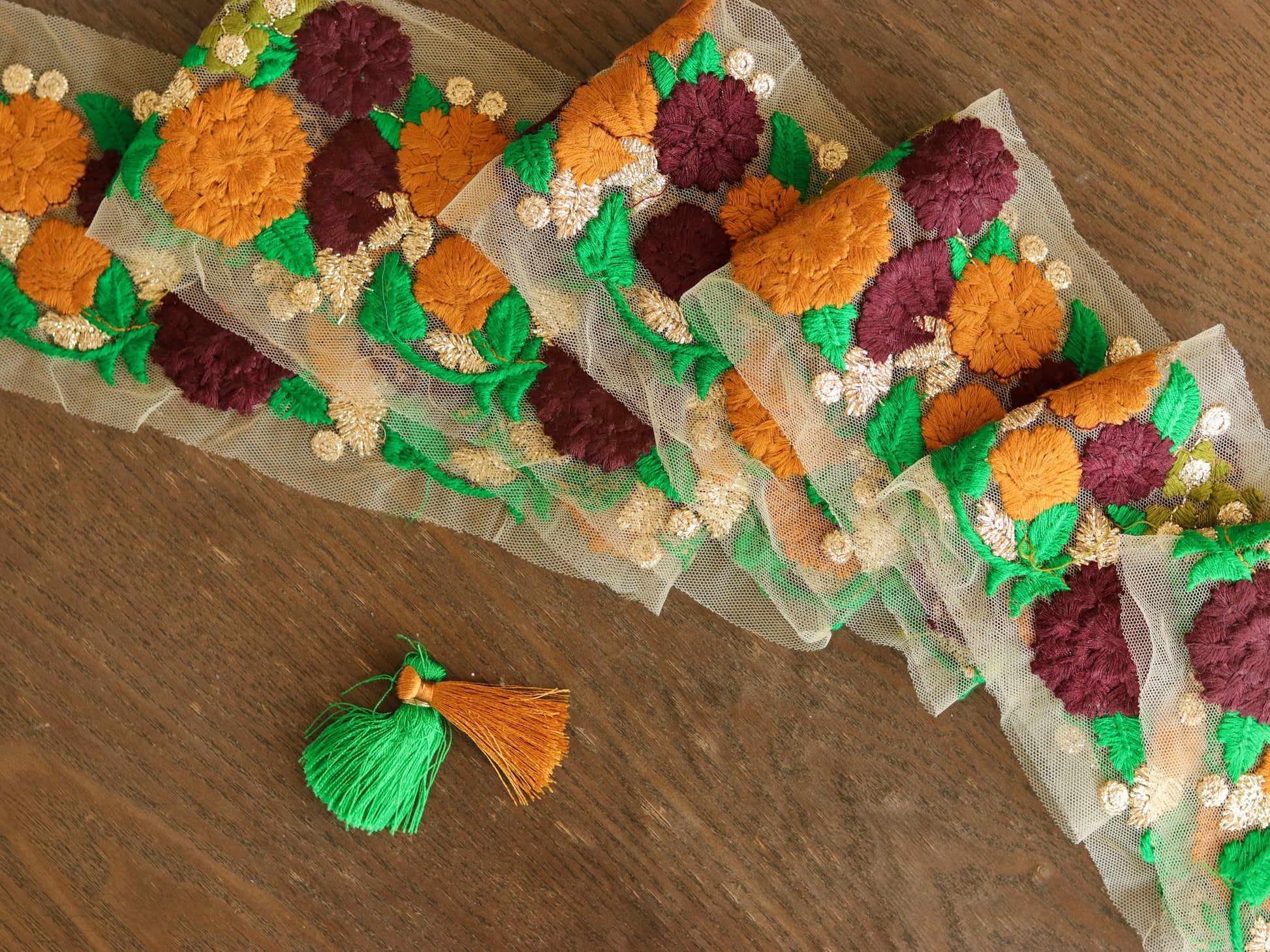 Let's celebrate Winter with this trim in muted fall colours. With dense floral embroidery in brown, ochre yellow and green, on a light beige net base. With a little bit of glam added with the gold sari. Bold and delicate at the same time, very pretty to use !