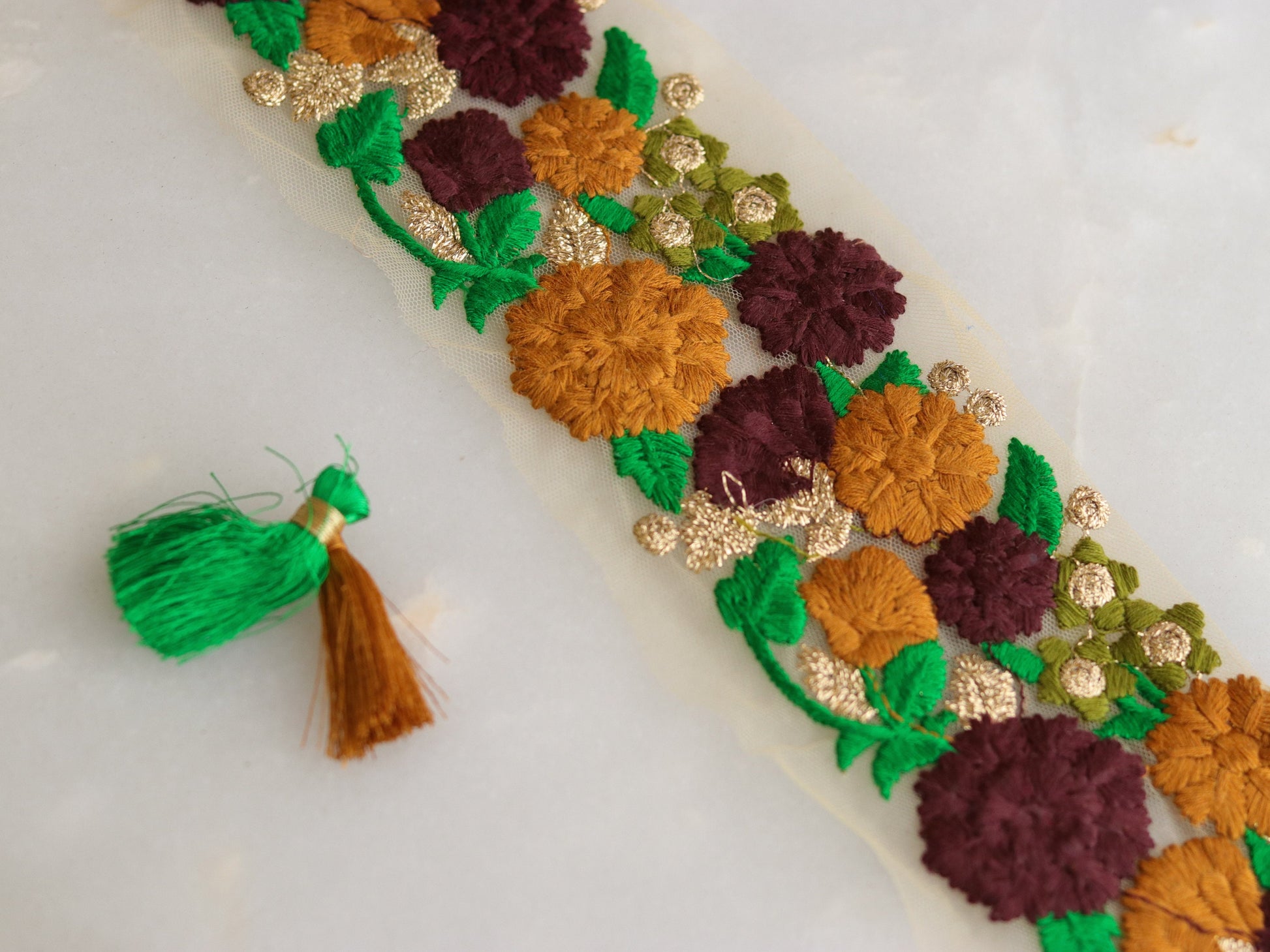 Brown Yellow Floral Embroidered Trim,Brown Floral Net Border,Embroidery Lace,Brown Yellow Floral Net Lace,Indian Trim,Saree Border,Price/mt