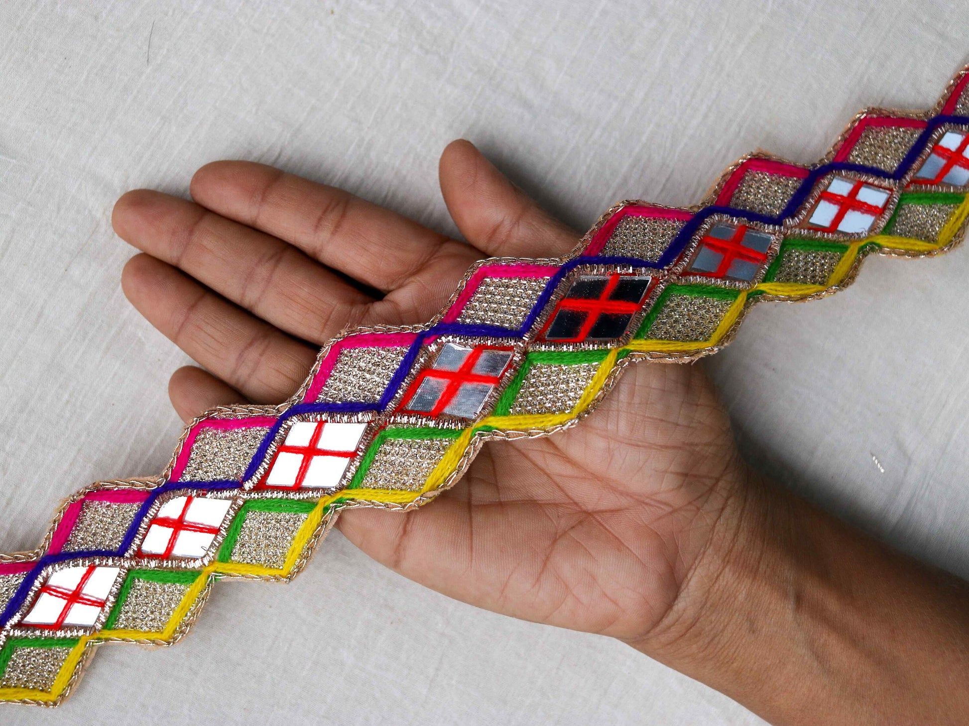 A beautiful trim with multicolour embroidery. Made evermore cheerful with small diamond shape real mirror pieces embroidered into it. Made in the Kutchi style of embroidery from the Kutch Gujarat region of India. With embroidery in vibrant pink, blue, yellow, green and red. Embellished with very light gold zari. Sure to bring loads of drama into any project!