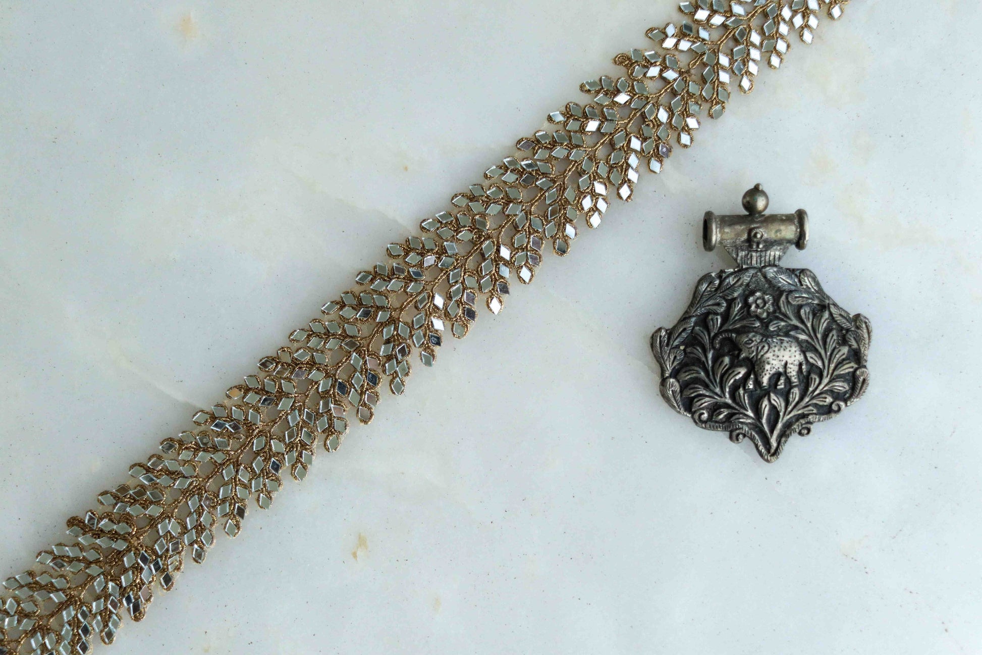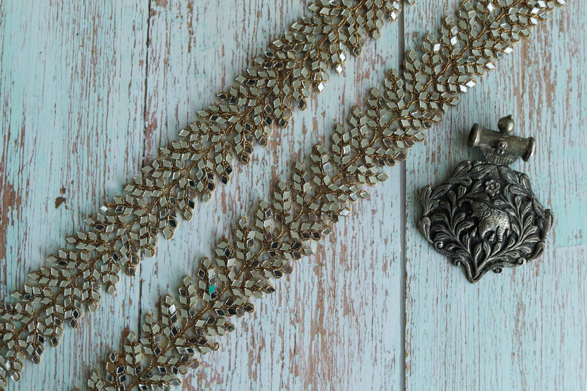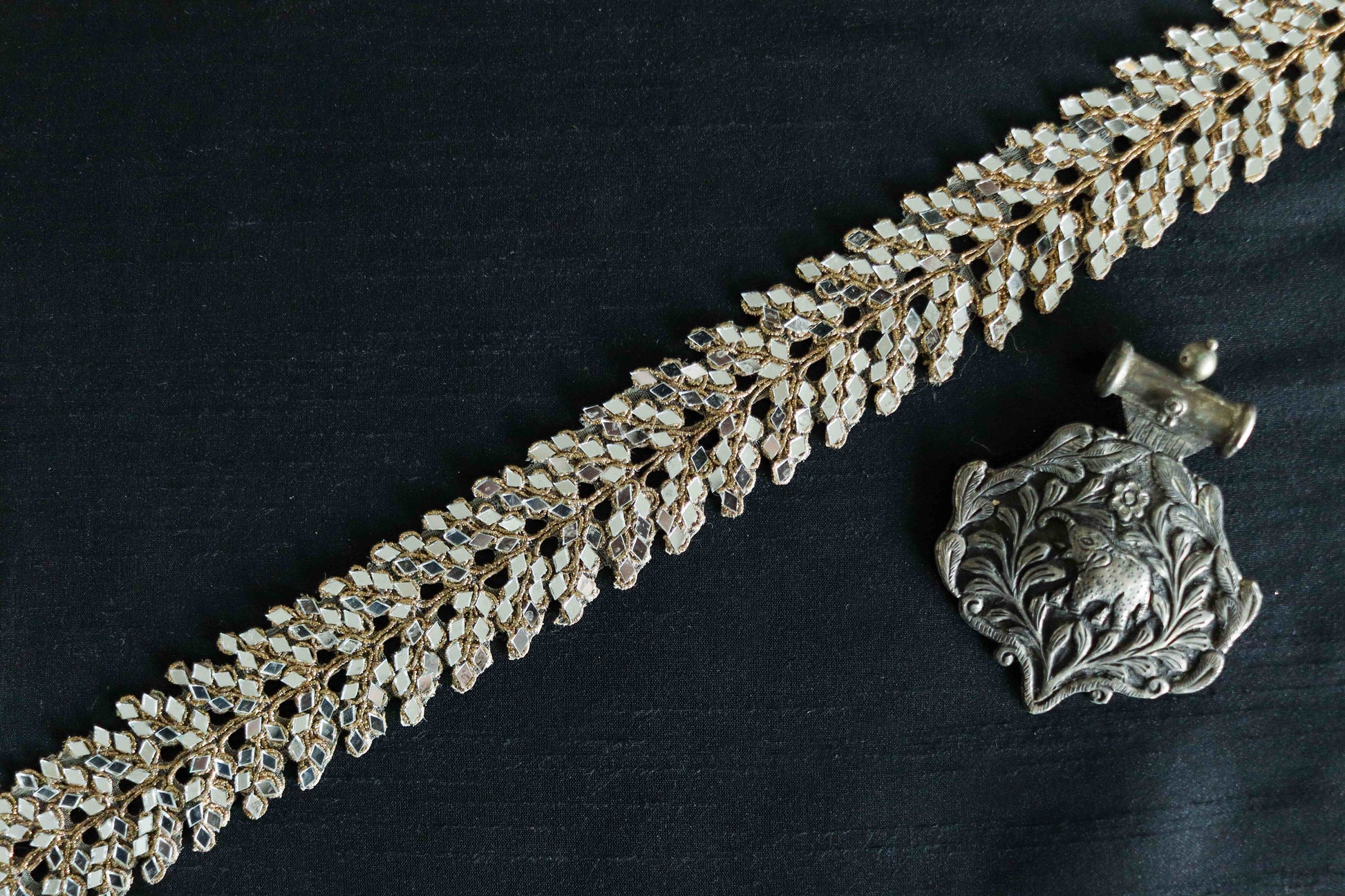 This delicate trim displays a floral vine created with tiny real mirror pieces. Made with intricate cutwork embroidery with light gold zari, this border has a very elegant look. Will convert anything it touches into royalty!