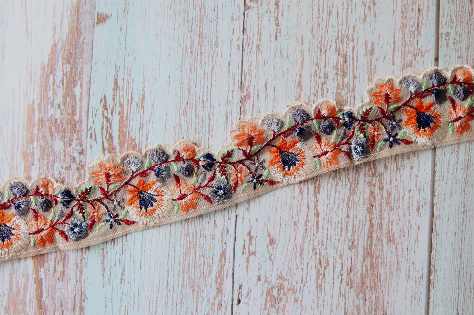 A delicate scallop trim with a pretty floral design. Created with cutwork in a scallop design. With intricate embroidery in white, pink, blue and light pastel sahdes. The scallop edges are trimmed with white, making it even more elegant. Sure to make any project you use it on stand out with its grace and beauty.