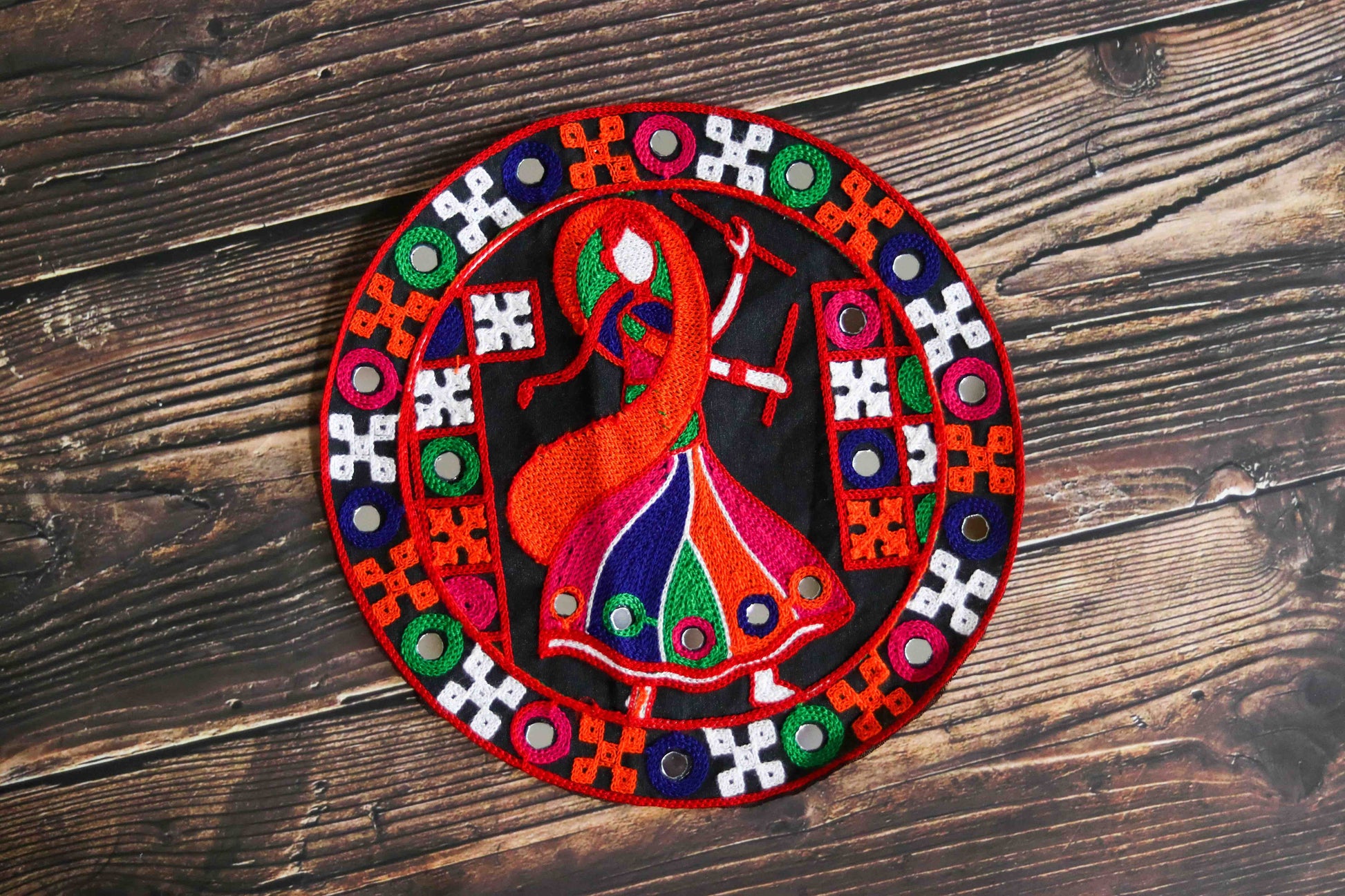 Garba Dancing Girl Indian Patch, Kutchi Embroidered Handmade Mirror Applique, Orange Black Boho Banjara Dandiya Quirky DIY Costume Patch