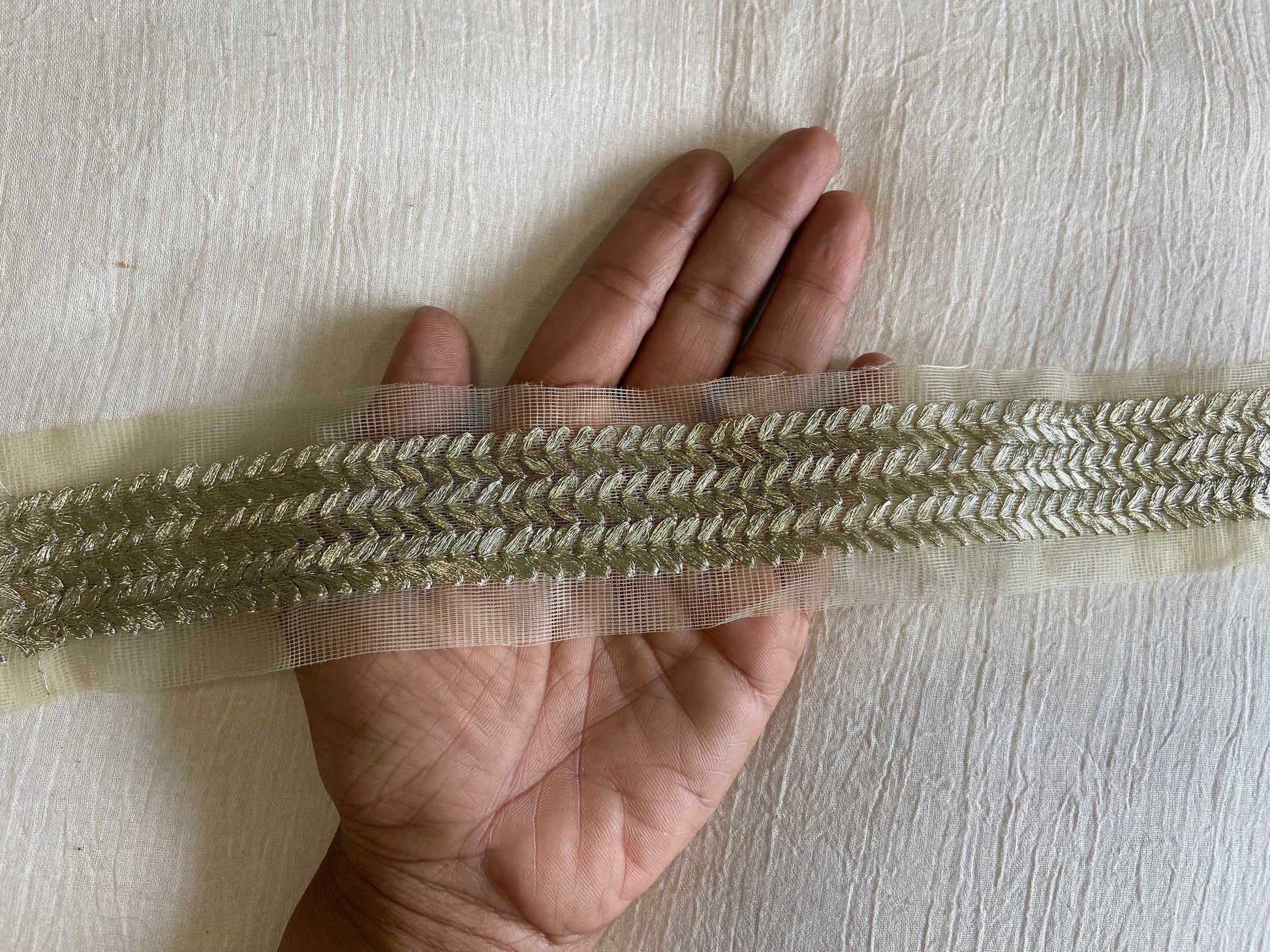Gold Herringbone Embroidered Net Trim, Indian Fabric Border, Stripes Gold Net Lace, Boho Gold Net Saree Border,