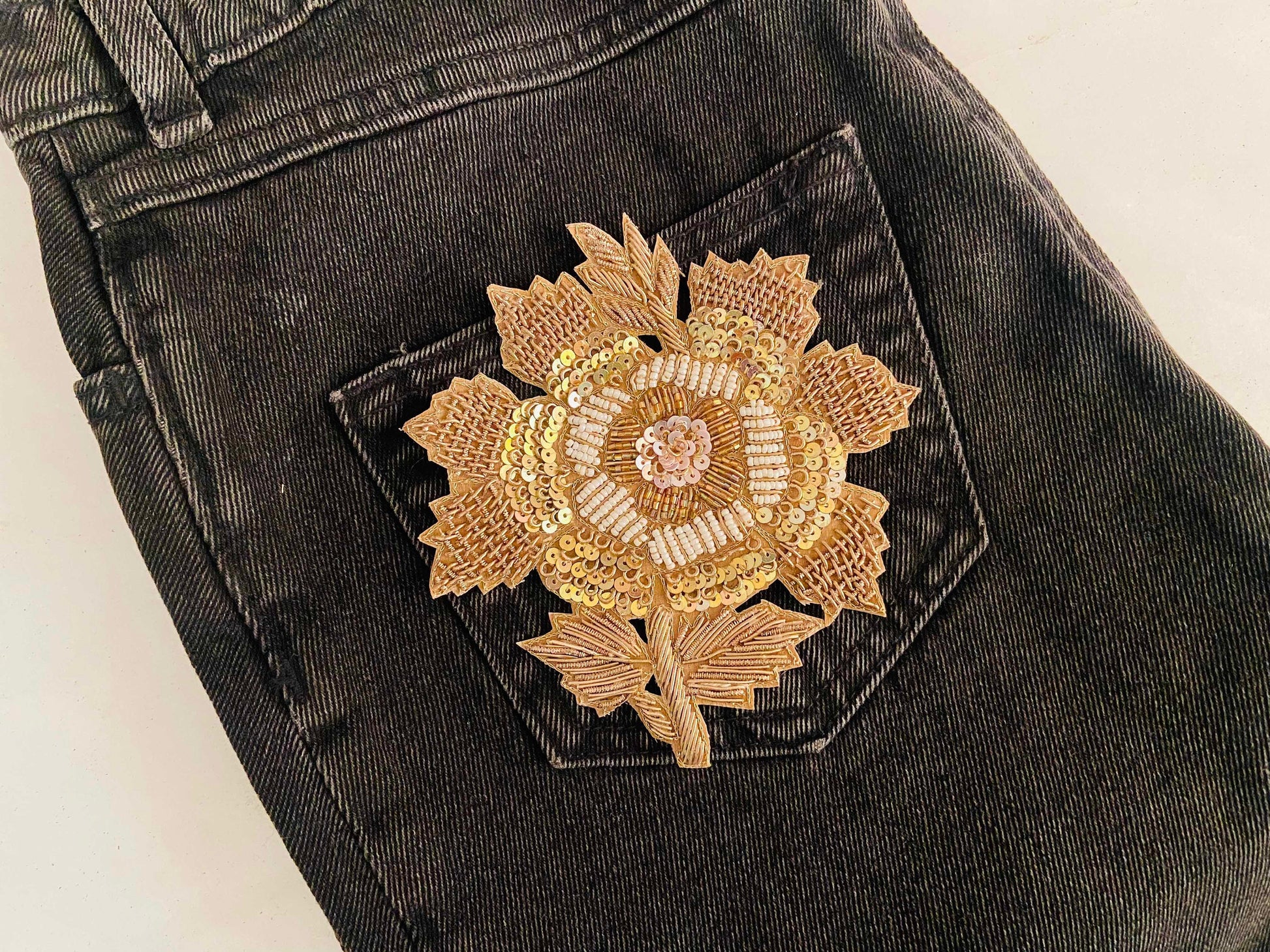 This gorgeous patch is handmade with intricate embroidery in shades of gold. Embellished with sequins and beads in light gold and rose gold, and small white beads.