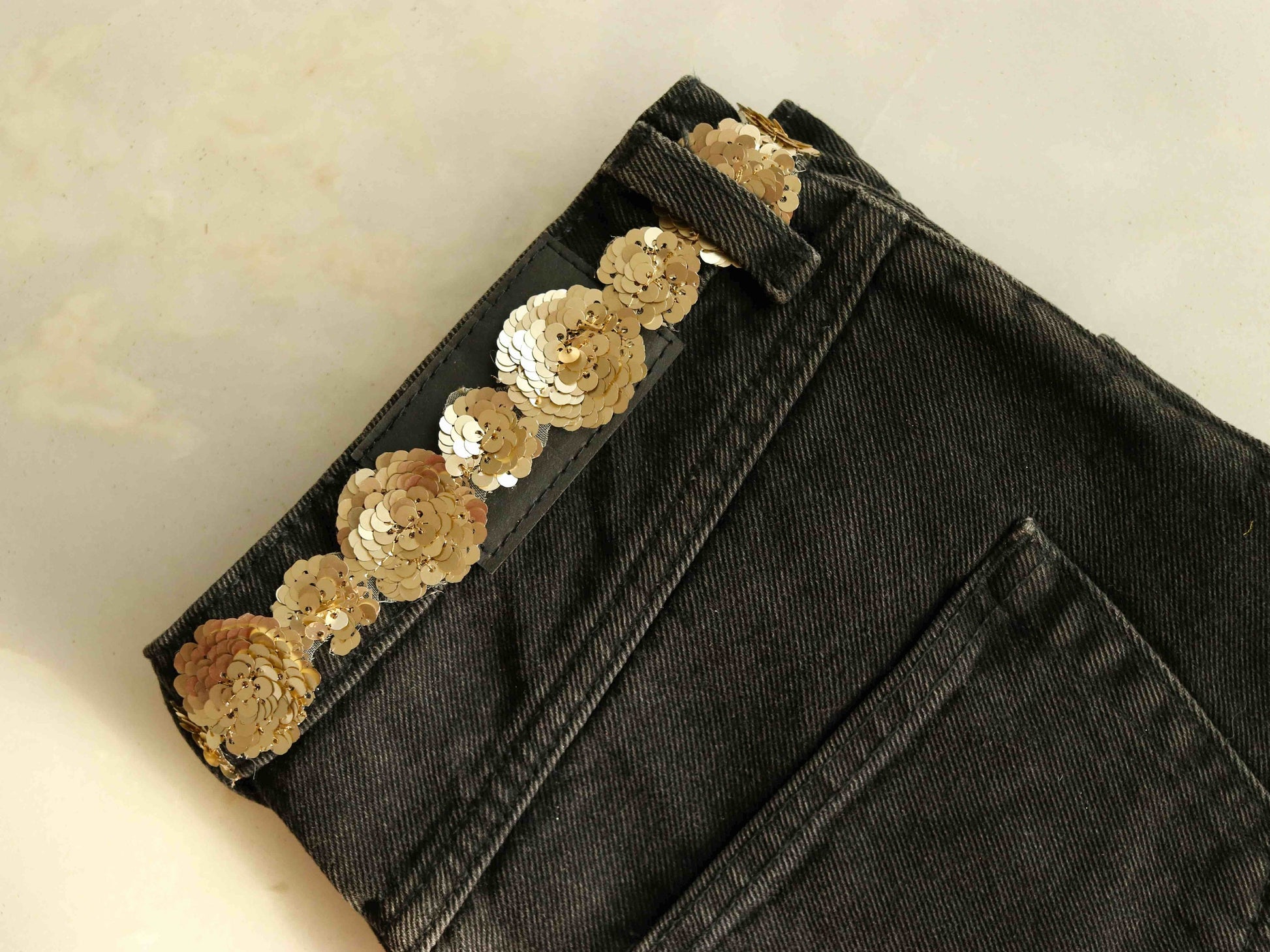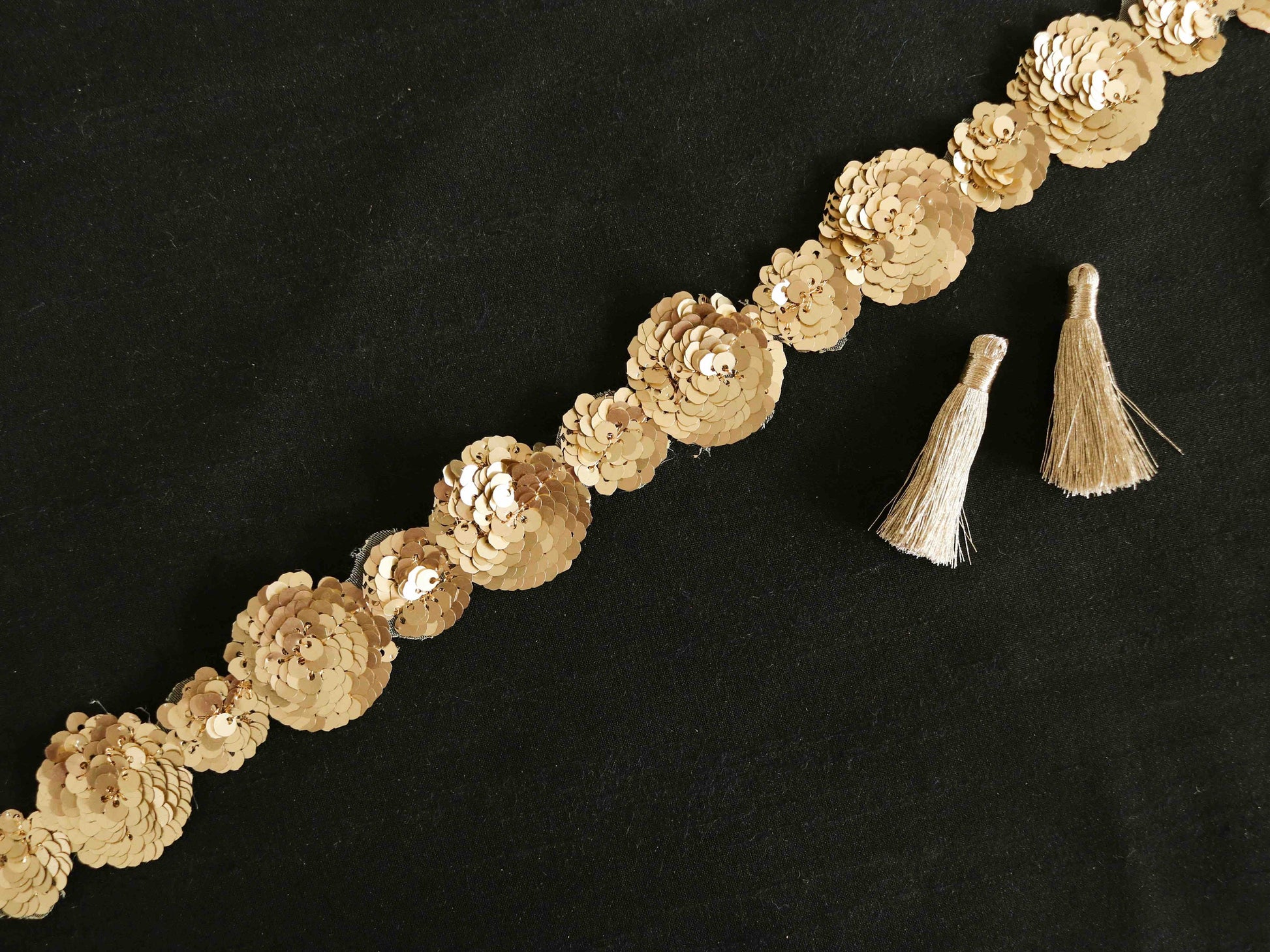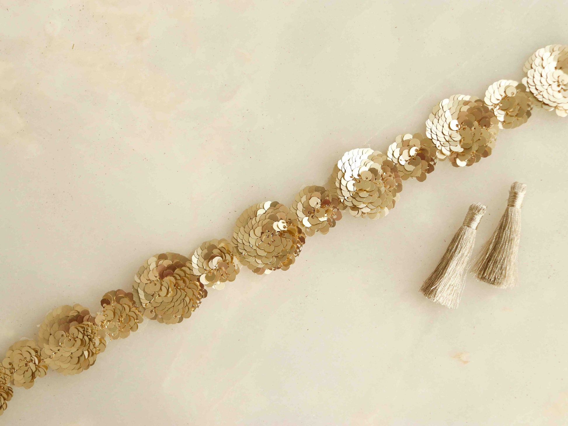 An ethereal trim showing a row of big and small florets. Each floret created with light gold sequins and zari. And sewn together with delicate cutwork, so that it will look like embroidery done directly onto your fabric. Sure to make any project you use it on stand out with its grace and beauty.