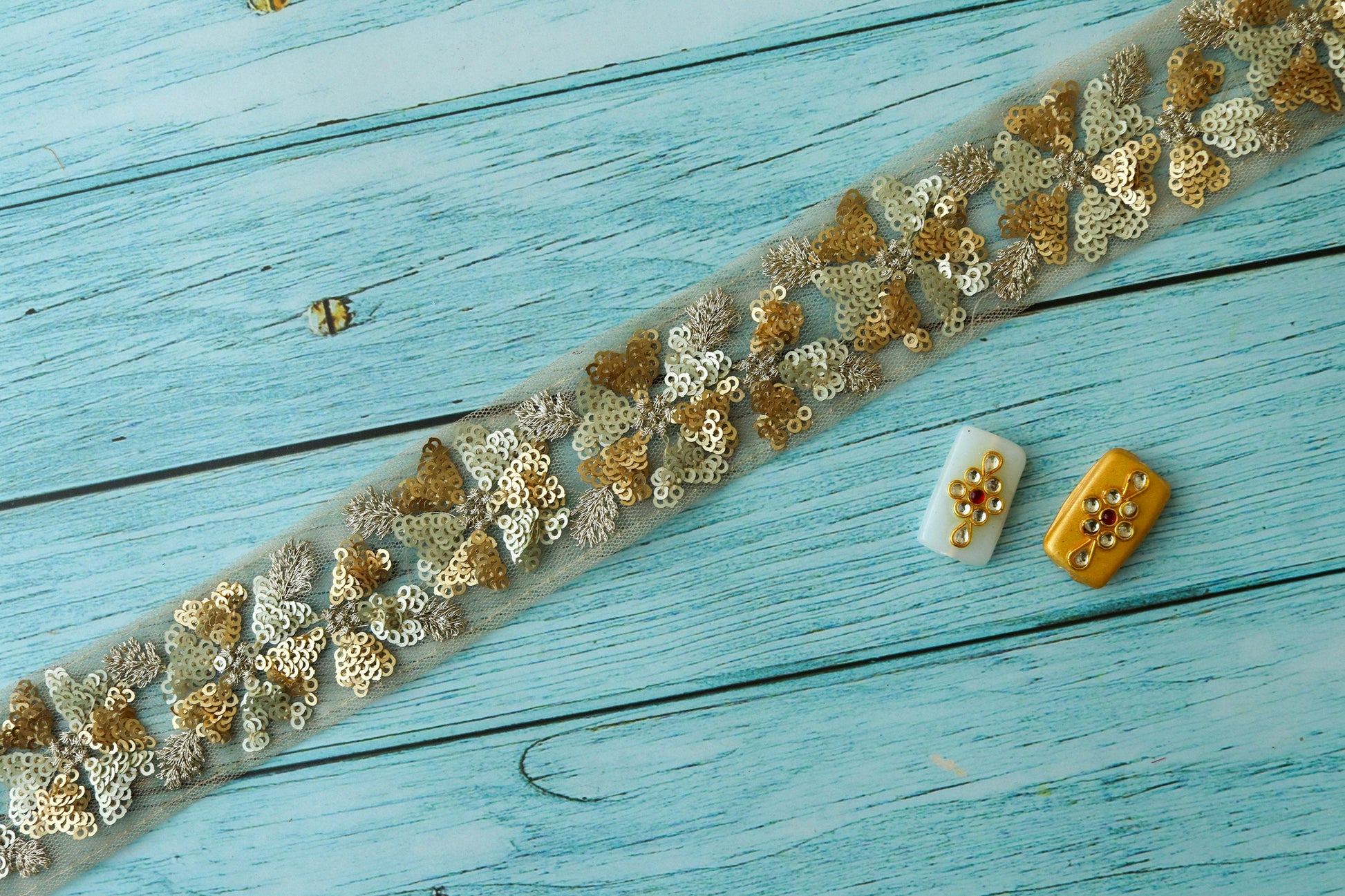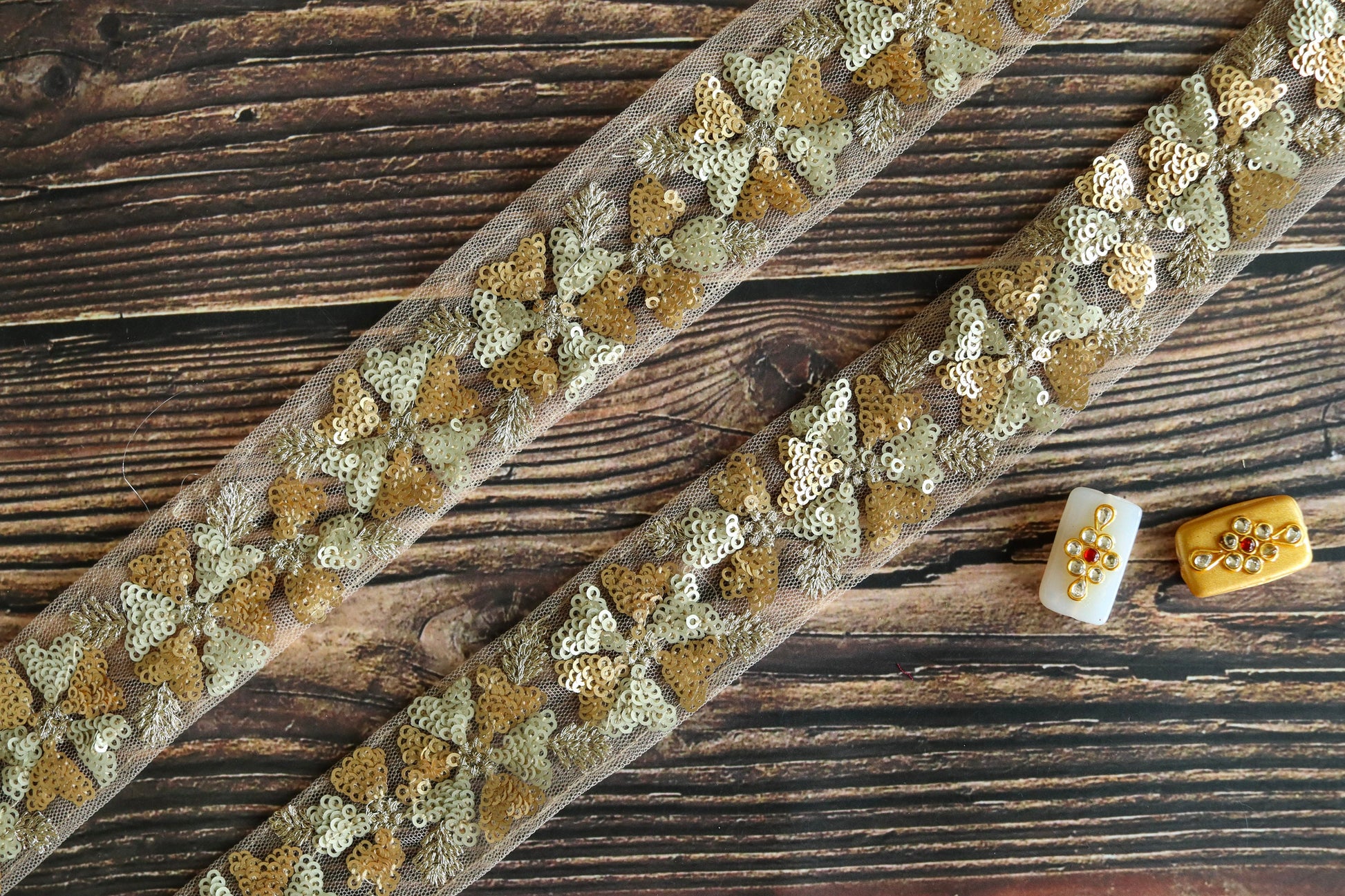 Gold Sequin Net Floral Trim, Light Gold Net Embroidered Border, Delicate Gold Lace, Indian Fabric Trim, Golden Saree Border,