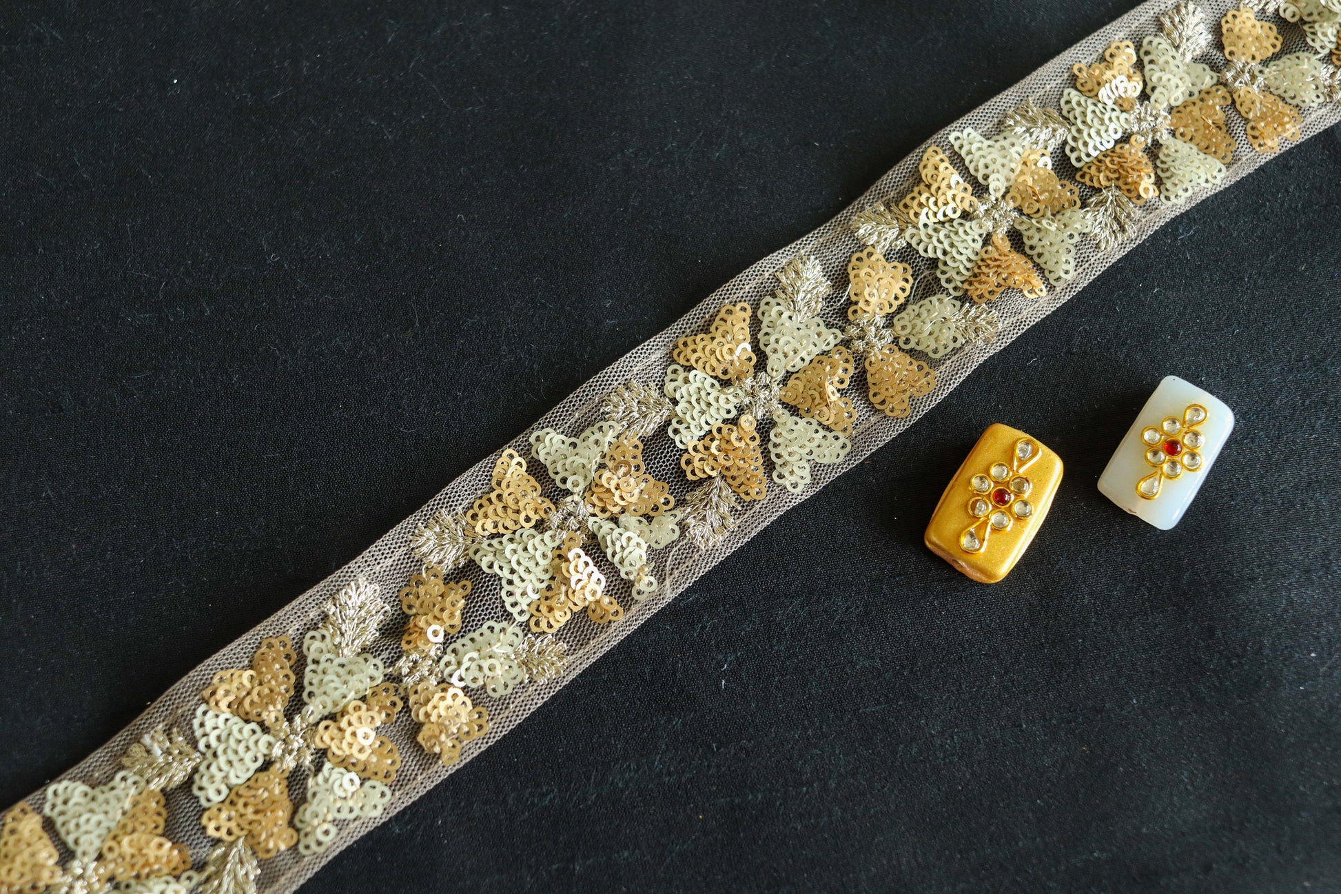 Gold Sequin Net Floral Trim, Light Gold Embroidered Border, Delicate Gold Lace, Indian Fabric Trim, Golden Saree Border, インド刺繍リボン, Price/mtr
