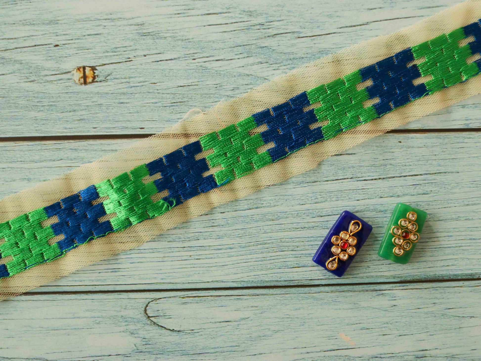 Green Checks Embroidered Phulkari Trim,Indian Border,Green Blue Geometric Multicolour Net Lace,Boho Hippie Phulkari Saree Border,Price/mtr