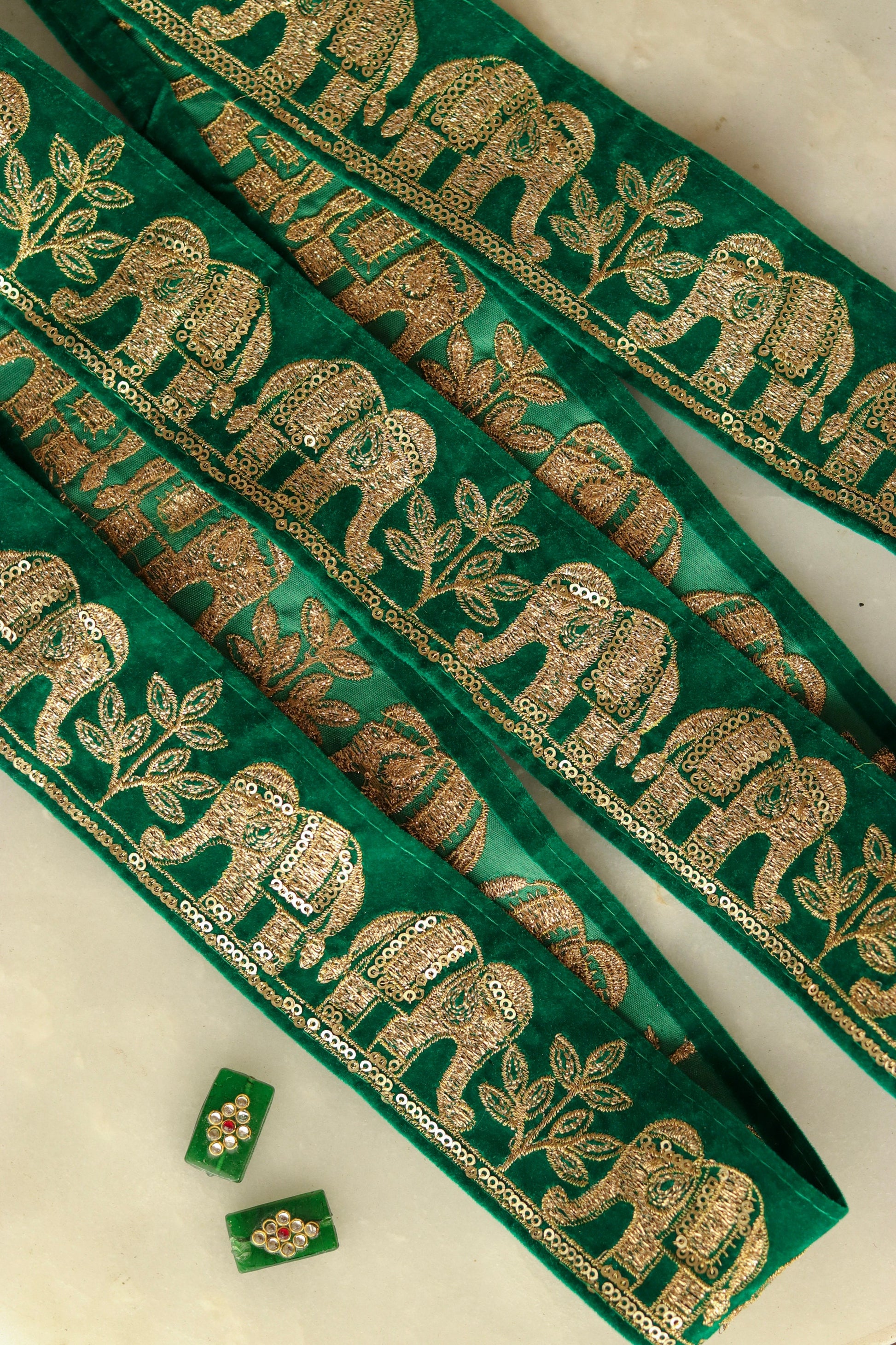 Green Gold Elephant Embroidered Trim,Green Gold Elephant Border,Green Gold Embroidery Lace,Boho Trim,Royal Indian Designer Trim, 75 cm