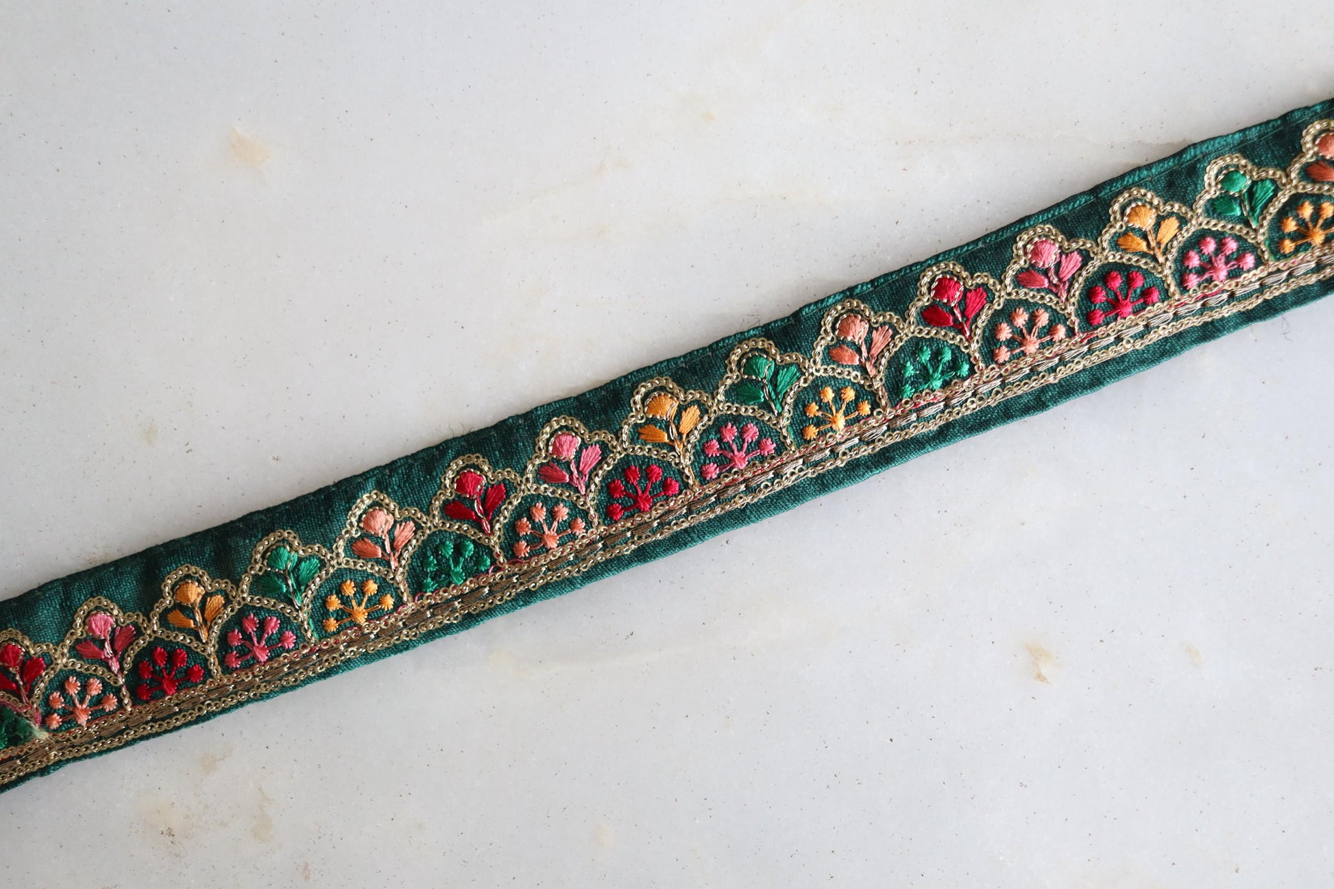 Very elegant and understated! A royal green slim trim. Embroidered with delicate flowers in many vibrant colours. Embellished with tiny gold sequins to add a touch of glam. Make it elegant or boho, style it your way!