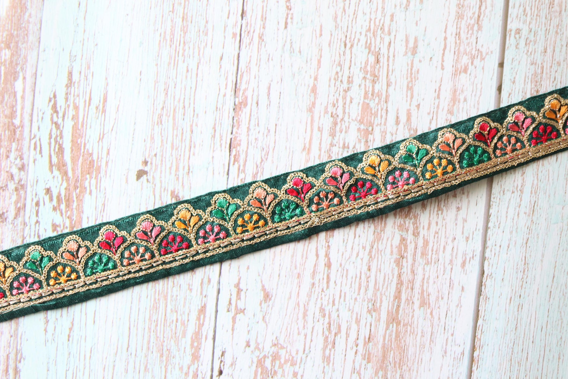 Green Gold Floral Embroidered Trim, Indian Fabric Embroidered Border, Green Multicolour Floral Lace, Saree Border, インド刺繍リボン, Price/mtr