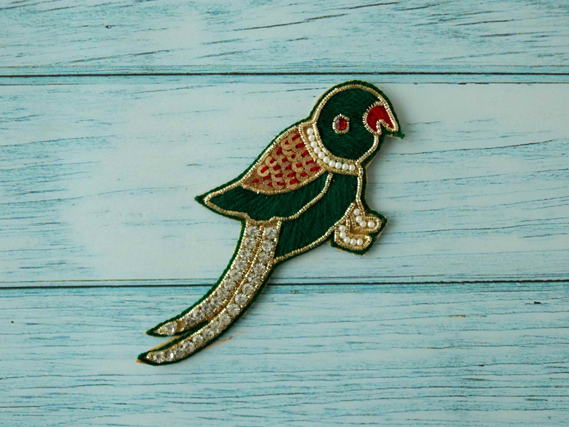 Green Gold Parrot embroidered patch,Handmade Parrot applique, Dark Green Gold bird patch,Quirky Boho DIY Bird Patch