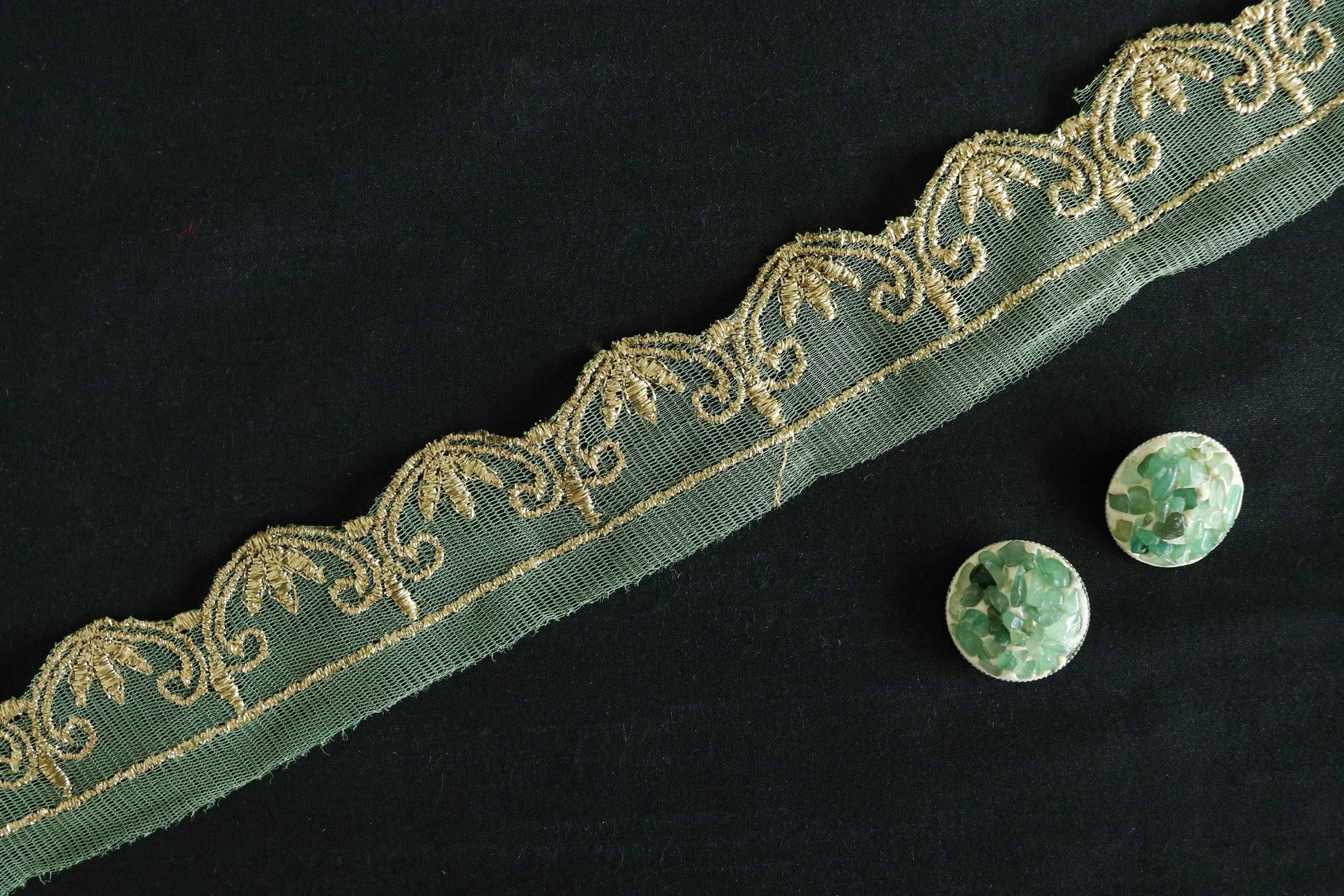 Green Gold Scallop Embroidered Trim,Mint Green Net Border,Cutwork Floral Net Lace,Indian Fabric Trim,Green Saree Border,Price/mtr